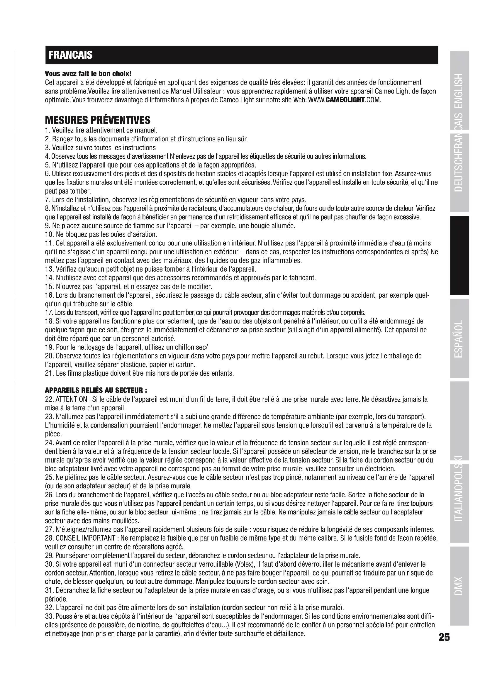 Nos conditions actuelles de garantie et de limitation de responsabilité sont disponibles à l‘adresse suivante : https://cdn-shop.adamhall.com/ media/pdf/Manufacturers-Declarations-CAMEO_DE_EN_ES_FR.pdf. Pour les réparations, veuillez contacter Adam Hall GmbH, Adam-Hall-Str. 1, 61267 Neu Anspach / E-Mail Info@adamhall.com / +49 (0)6081 / 9419-0. TRI ET MISE AUX DÉCHETS CORRECTE DE CE PRODUIT (Valid in the European Union and other European countries with waste separation) (Applicable dans l‘Union Européenne et les autres pays européens pratiquant le tri des déchets) La présence de ce symbole sur le produit ou sur la documentation correspondante indique qu‘en fin de vie, le produit ne doit pas être jeté avec les déchets normaux, afin d‘éviter tout dommage à l‘environnement ou aux personnes consécutive à une élimination non contrôlée des déchets. Séparez-le des aut- res types de déchets et recyclez-le, afin de promouvoir la réutilisation durable des ressources naturelles. Nous conseillons aux utilisateurs non professionnels de contacter le revendeur chez qui ils ont acheté le produit, ou un représentant gouvernemental local, pour plus de détails sur le lieu de collecte et la façon de recycler cet appareil dans le meilleur respect de l‘environnement possible.. Nous invitons les utilisateurs professionnels à contacter leur fournisseur et à vérifier les termes et conditions de leur contrat d‘achat. Ce produit ne doit pas être mélangé à d‘autres déchets commerciaux lors de la collecte. Conformité CE La société Adam Hall GmbH déclare par la présente que ce produit est compatible avec les régulations suivantes (le cas échéant) : R&TTE (1999/5/EG) et RED (2014/53/EU) à partir de juin 2017 Directive basse tension (2014/35/EU) Directive CEM (2014/30/EU) RoHS (2011/65/EU) La Déclaration de Conformité complète est disponible sur le site Web www.adamhall.com. Pour toute information complémentaire, contactez-nous : info@adamhall.com.36 DMX ITALIANO POLSKI ESPAÑOL FRANCAIS DEUTSCHENGLISH ESPAÑOL ¡GRACIAS POR ELEGIR CAMEO LIGHT! Este equipo está diseñado y fabricado con los estándares de calidad más exigentes, para garantizar un correcto funcionamiento durante muchos años.Lea atentamente este manual de usuario para poder aprovechar rápidamente toda la funcionalidad de su nuevo producto de Cameo Light. Más información sobre Cameo Light en la web WWW.CAMEOLIGHT.COM.