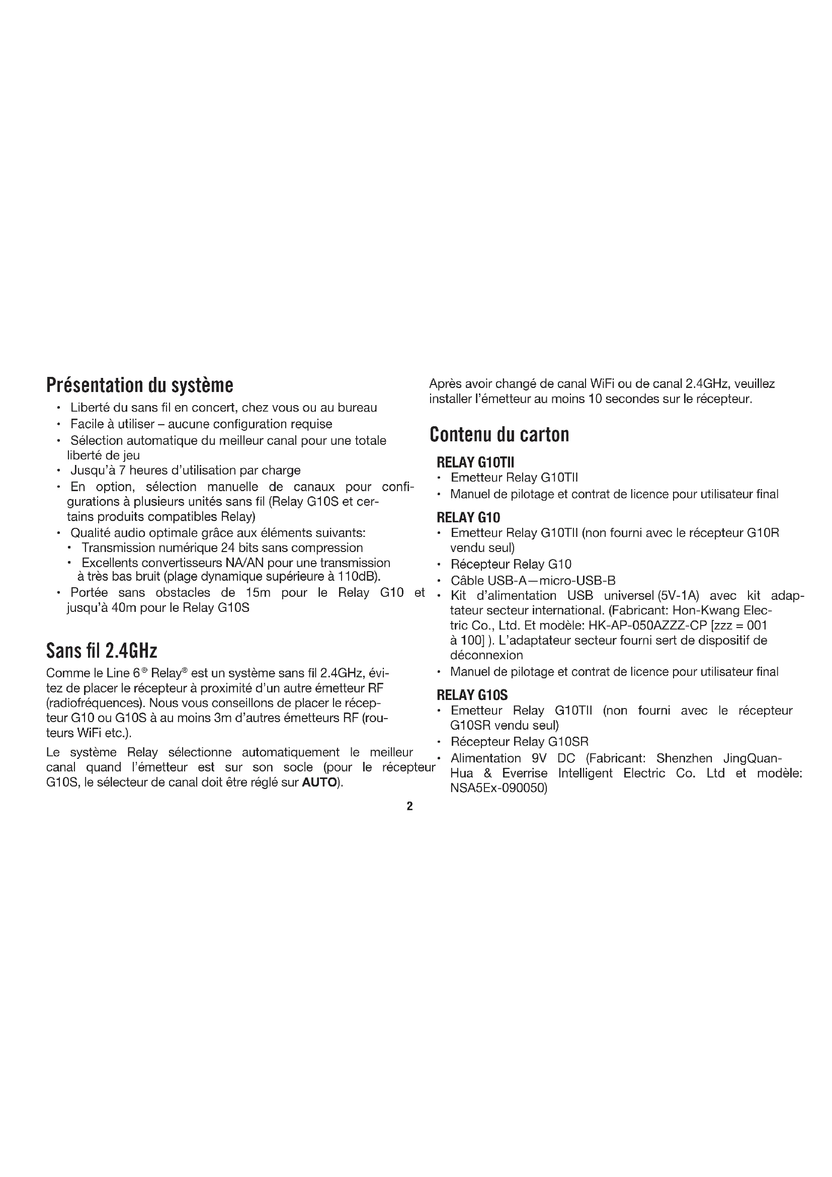 estunsystèmesansl2.4GHz,évi tezdeplacerlerécepteuràproximitéd’unautreémetteurRF (radiofréquences).Nousvousconseillonsdeplacerlerécep teurG10ouG10Sàaumoins3md’autresémetteursRF(rou teursWiFietc.). Le système Relay sélectionne automatiquement le meilleur canal quand l’émetteur est sur son socle (pour le récepteur G10S,lesélecteurdecanaldoitêtreréglésurAUTO). AprèsavoirchangédecanalWiFioudecanal2.4GHz,veuillez installerl’émetteuraumoins10secondessurlerécepteur. Contenu du carton