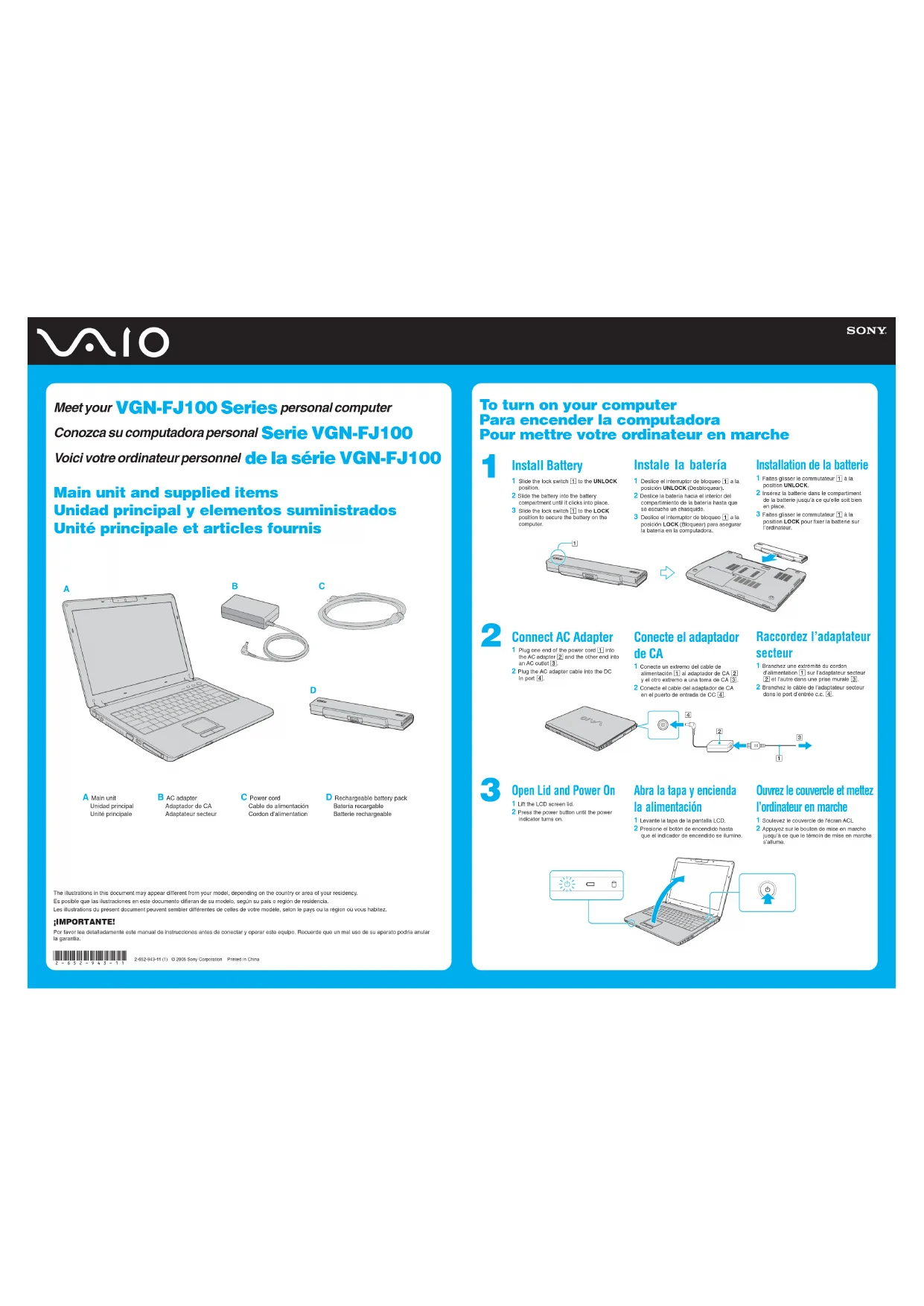 Si votre ordinateur est branché à un écran externe, comme un écran multimédia, assurez-vous que cet écran est branché à une alimentation électrique et allumé. Il faudra peut-être ajuster les commandes de luminosité et de contraste. Veuillez consulter le guide qui accompagne votre écran pour de plus amples renseignements. ■ Si l’ordinateur démarre avec une disquette insérée, éjectez la disquette de son lecteur (le cas échéant). ■ Si vous remarquez de la condensation sur l’ordinateur, n’utilisez pas celui-ci pendant au moins une heure. La condensation peut causer un dysfonctionnement de l’ordinateur. HDD recovery Recuperación de la unidad de disco duro Récupération du disque dur 1 Click Start > All Programs > VAIO Support Central. 2 Click VAIO Documentation. 3 Click VAIO User Guide. 1 Haga clic en Inicio > Todos los programas > VAIO Support Central. 2 Haga clic en Documentación de VAIO. 3 Haga clic en Guía de Usuario de VAIO. 1 Cliquez sur Démarrer > Tous les programmes > VAIO Support Central. 2 Cliquez sur Documentation du VAIO. 3 Cliquez sur VAIO Manuel D'Utilisateur. Locate the User Guide Ubique la Guía del usuario Repérez le Guide de l’utilisateur