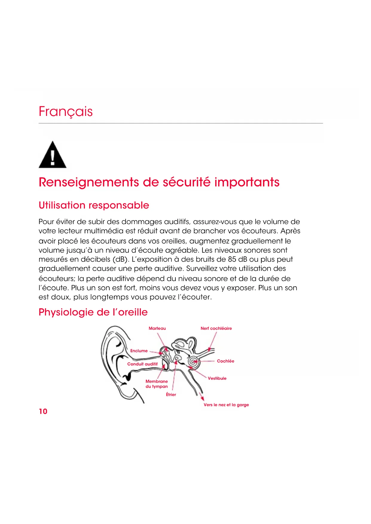 | Sécurité | Éviter une exposition prolongée à des volumes élevés pour prévenir les dommages auditifs. |