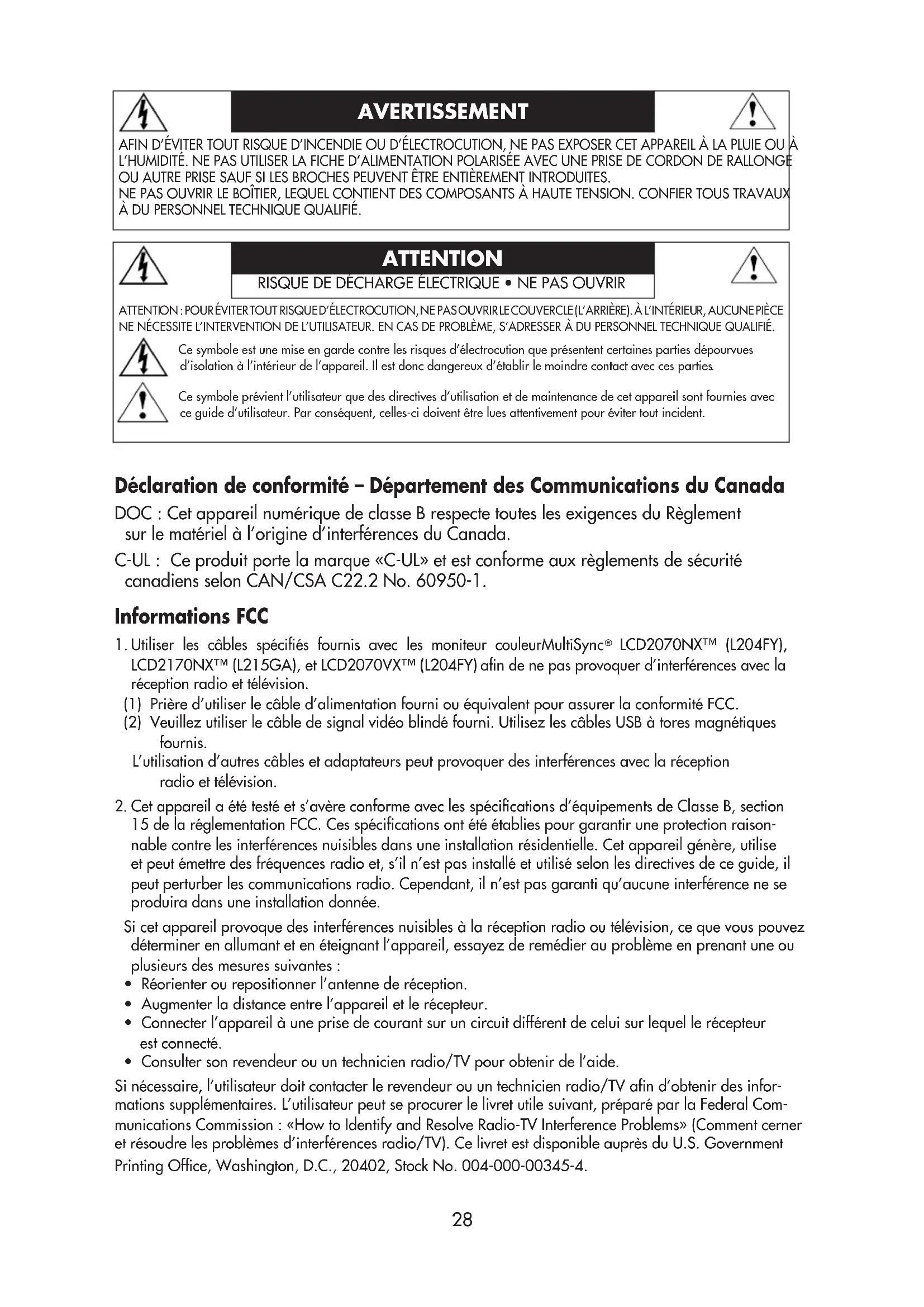 LCD2070NX™ (L204FY), LCD2170NX™ (L215GA), et LCD2070VX™ (L204FY) afin de ne pas provoquer d’interférences avec la réception radio et télévision. (1) Prière d’utiliser le câble d’alimentation fourni ou équivalent pour assurer la conformité FCC. (2) Veuillez utiliser le câble de signal vidéo blindé fourni. Utilisez les câbles USB à tores magnétiques fournis. L’utilisation d’autres câbles et adaptateurs peut provoquer des interférences avec la réception radio et télévision.