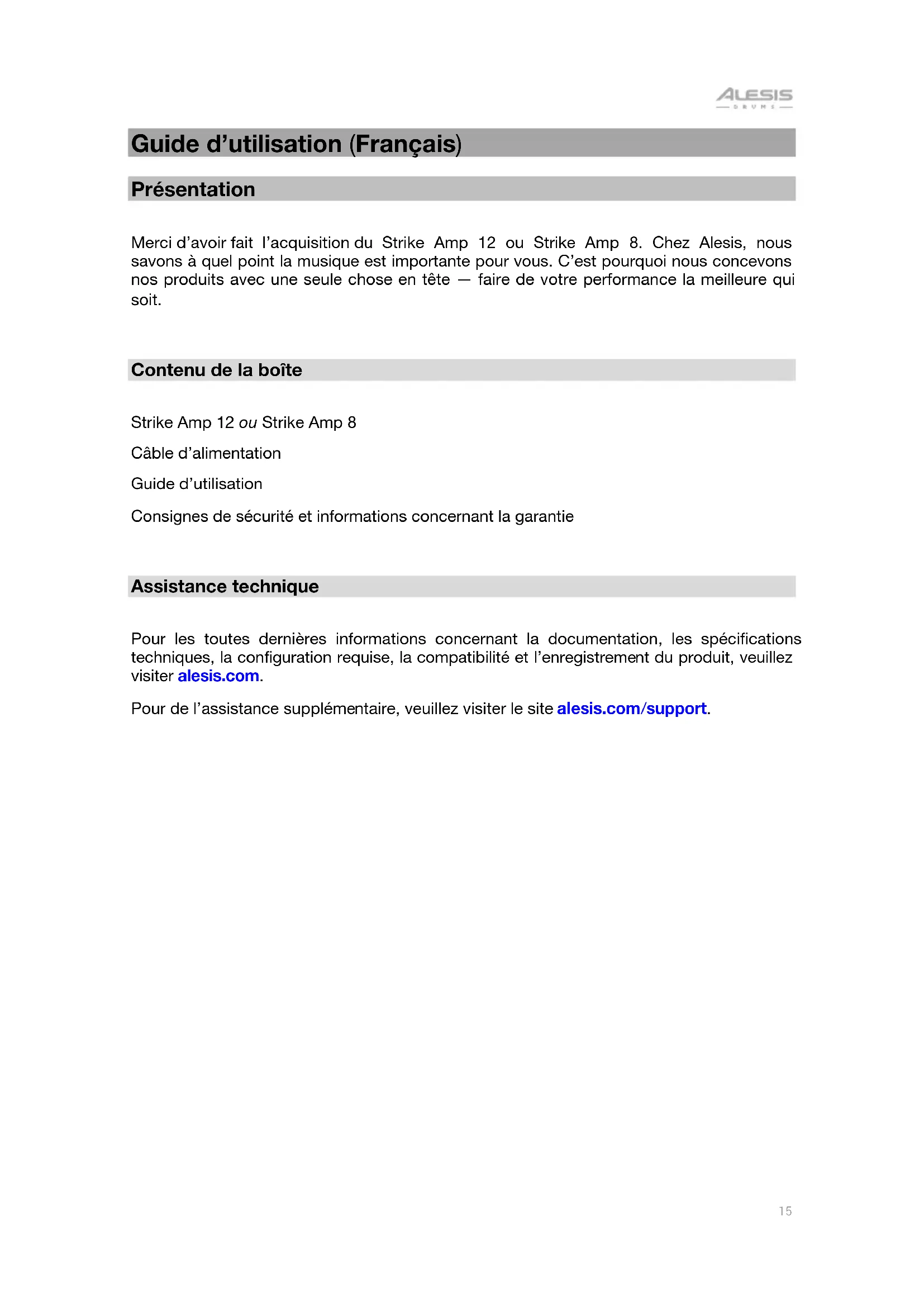 Guide d’utilisation (Français) Présentation Merci d’avoir fait l’acquisition du Strike Amp 12 ou Strike Amp 8. Chez Alesis, nous savons à quel point la musique est importante pour vous. C’est pourquoi nous concevons nos produits avec une seule chose en tête — faire de votre performance la meilleure qui soit.