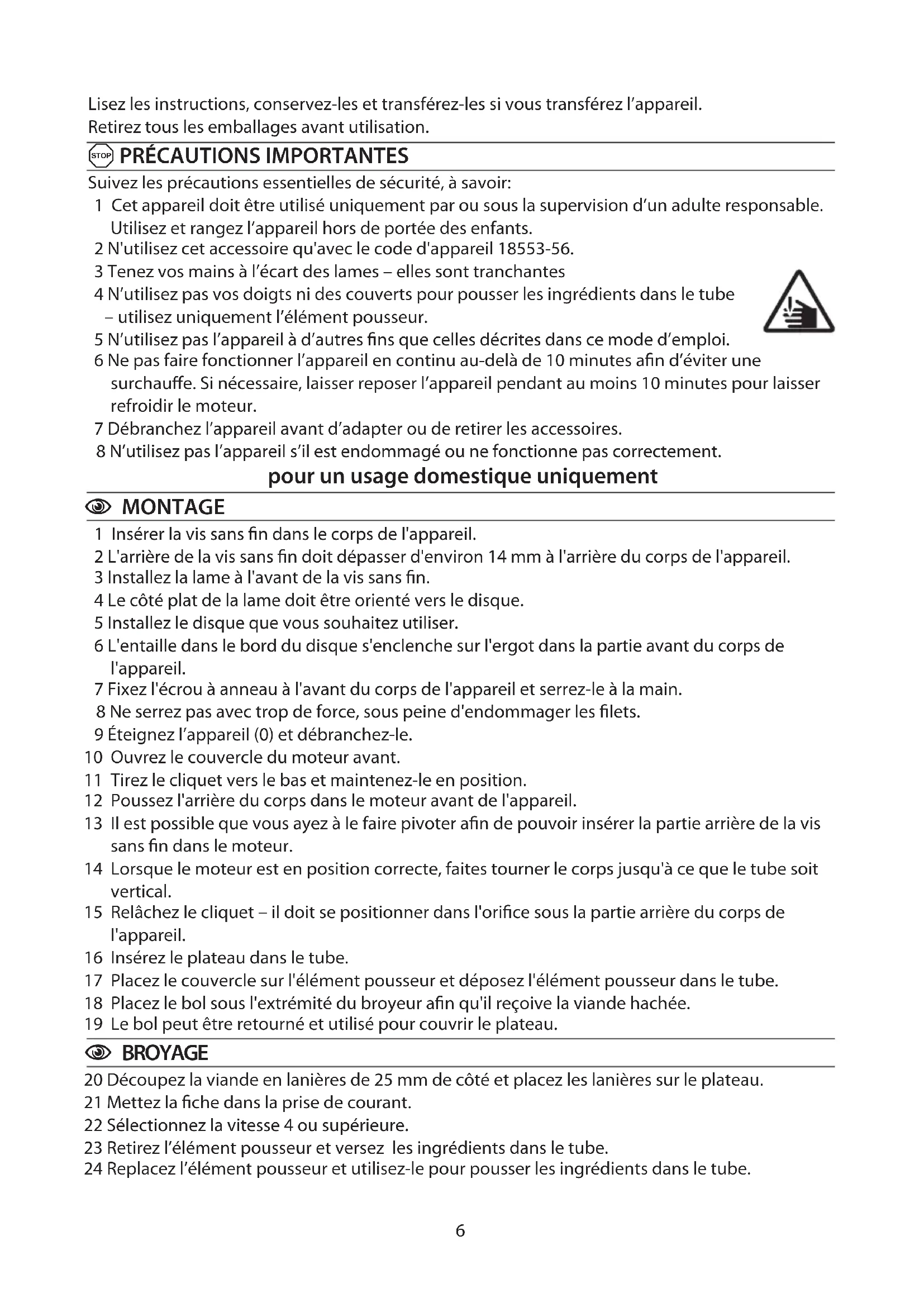 Suivez les précautions essentielles de sécurité, à savoir: 1 Cet appareil doit être utilisé uniquement par ou sous la supervision d’un adulte responsable. Utilisez et rangez l’appareil hors de portée des enfants. 2 N'utilisez cet accessoire qu'avec le code d'appareil 18553-56. 3 Tenez vos mains à l’écart des lames – elles sont tranchantes 4 N’utilisez pas vos doigts ni des couverts pour pousser les ingrédients dans le tube – utilisez uniquement l’élément pousseur. 5 N’utilisez pas l’appareil à d’autres fins que celles décrites dans ce mode d’emploi. 6 Ne pas faire fonctionner l’appareil en continu au-delà de 10 minutes afin d’éviter une surchauffe. Si nécessaire, laisser reposer l’appareil pendant au moins 10 minutes pour laisser refroidir le moteur. 7 Débranchez l’appareil avant d’adapter ou de retirer les accessoires. 8 N’utilisez pas l’appareil s’il est endommagé ou ne fonctionne pas correctement. pour un usage domestique uniquement C MONTAGE 1 Insérer la vis sans fin dans le corps de l'appareil. 2 L'arrière de la vis sans fin doit dépasser d'environ 14 mm à l'arrière du corps de l'appareil. 3 Installez la lame à l'avant de la vis sans fin. 4 Le côté plat de la lame doit être orienté vers le disque. 5 Installez le disque que vous souhaitez utiliser. 6 L'entaille dans le bord du disque s'enclenche sur l'ergot dans la partie avant du corps de l'appareil. 7 Fixez l'écrou à anneau à l'avant du corps de l'appareil et serrez-le à la main. 8 Ne serrez pas avec trop de force, sous peine d'endommager les filets. 9 Éteignez l’appareil () et débranchez-le. 10 Ouvrez le couvercle du moteur avant. 11 Tirez le cliquet vers le bas et maintenez-le en position. 12 Poussez l'arrière du corps dans le moteur avant de l'appareil. 13 Il est possible que vous ayez à le faire pivoter afin de pouvoir insérer la partie arrière de la vis sans fin dans le moteur. 14 Lorsque le moteur est en position correcte, faites tourner le corps jusqu'à ce que le tube soit vertical. 15 Relâchez le cliquet – il doit se positionner dans l'orifice sous la partie arrière du corps de l'appareil. 16 Insérez le plateau dans le tube. 17 Placez le couvercle sur l'élément pousseur et déposez l'élément pousseur dans le tube. 18 Placez le bol sous l'extrémité du broyeur afin qu'il reçoive la viande hachée. 19 Le bol peut être retourné et utilisé pour couvrir le plateau. C BROYAGE 20 Découpez la viande en lanières de 25 mm de côté et placez les lanières sur le plateau. 21 Mettez la fiche dans la prise de courant. 22 Sélectionnez la vitesse 4 ou supérieure. 23 Retirez l’élément pousseur et versez les ingrédients dans le tube. 24 Replacez l’élément pousseur et utilisez-le pour pousser les ingrédients dans le tube.7 25 Lorsque vous avez terminé, passez des rognures de pain dans le hachoir pour nettoyer le disque de hachage. 26 Éteignez l’appareil () et débranchez-le. C QUEL DISQUE DE HACHAGE CHOISIR ? 27 Utilisez le disque de hachage fin pour hacher de la viande crue en vue d'obtenir de la viande hachée ou des boulettes de viande, et pour le zeste des agrumes. 28 Si vous avez besoin d'un mouture extra-fine, pour la préparation de saucisses ou de pâté, passez de nouveau la viande dans le hachoir. 29 Utilisez le disque de hachage grossier pour hacher de la viande crue pour les hamburgers. 30 Pour le hachage d'autres aliments, utilisez le disque qui vous donne la taille de hachage souhaitée.