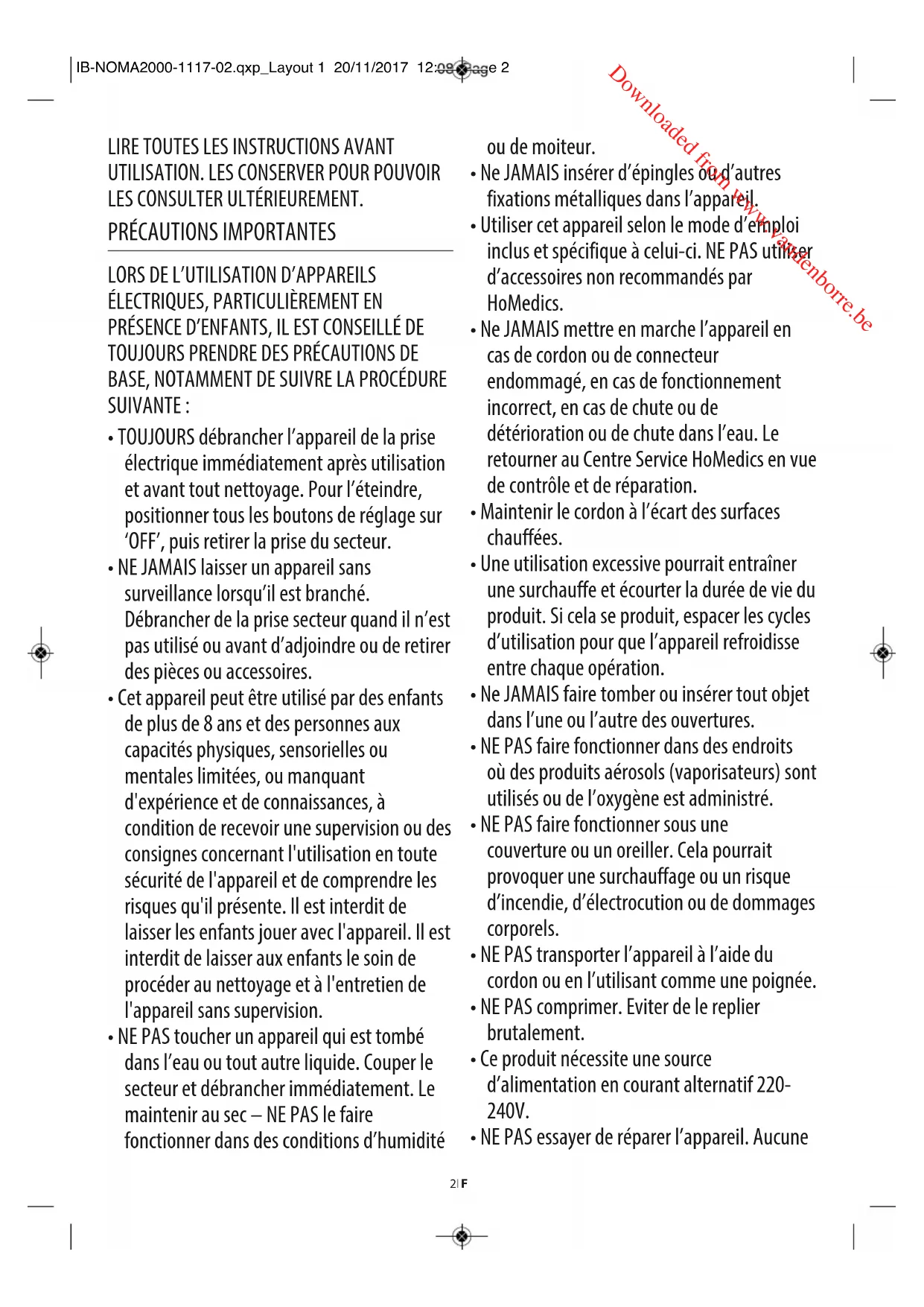 - NE PAS essayer de réparer l’appareil. Aucune IB-NOMA2000-1117-02.qxp_Layout 1 20/11/2017 12:08 Page 2 Downloaded from www.vandenborre.beF I 3 pièce ne peut être remise en état par l’utilisateur. L’envoyer à un Centre Service HoMedics pour réparation. Tout dépannage de cet appareil doit être réalisé uniquement pas un personnel de service HoMedics agréé.