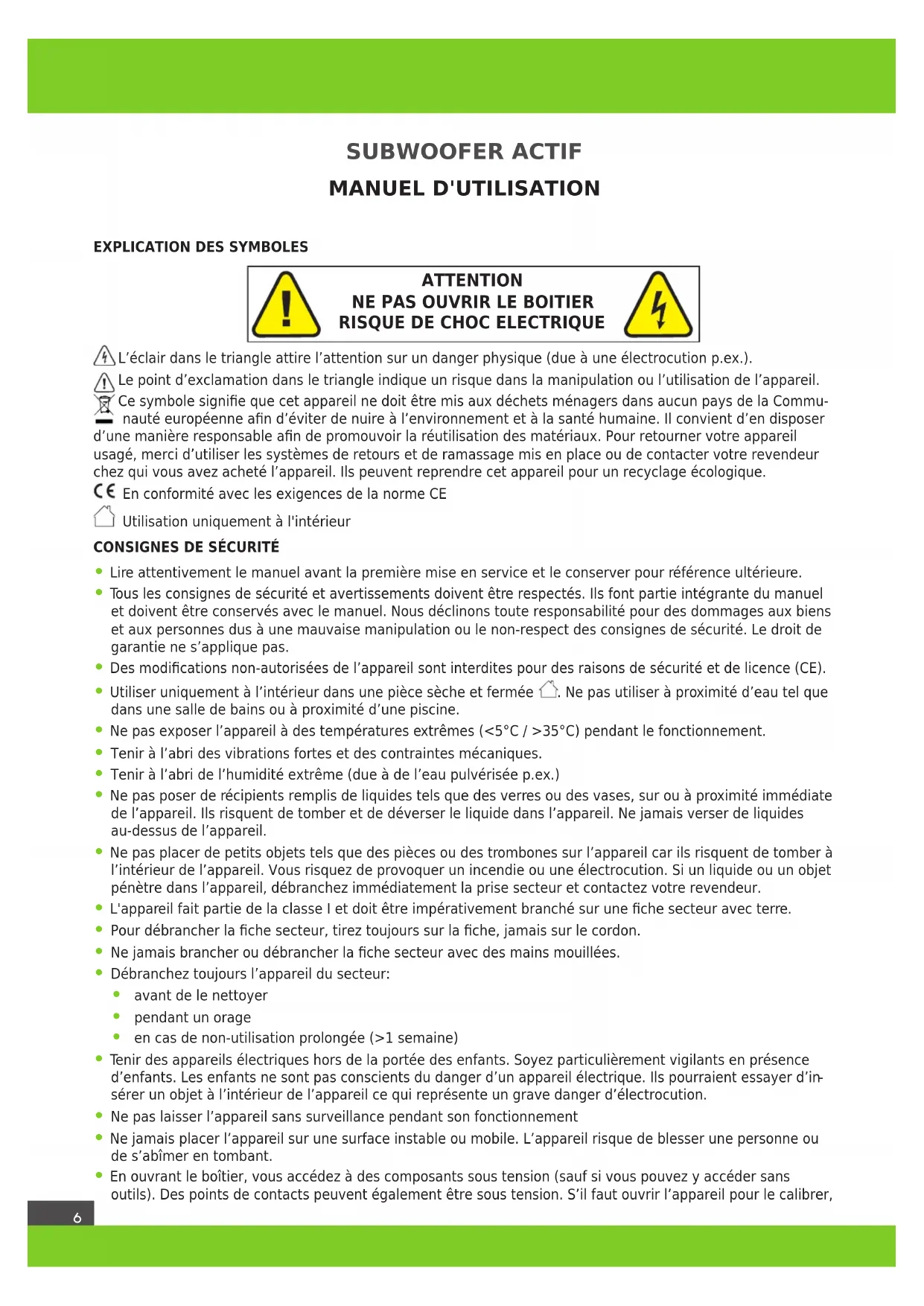 © Lotronic 2019 SUBWOOFER ACTIF MANUEL D'UTILISATION EXPLICATION DES SYMBOLESL’éclair dans le triangle attire l’attention sur un danger physique (due à une électrocution p.ex.).Le point d’exclamation dans le triangle indique un risque dans la manipulation ou l’utilisation de l’appareil. Ce symbole signie que cet appareil ne doit être mis aux déchets ménagers dans aucun pays de la Commu- nauté européenne an d’éviter de nuire à l’environnement et à la santé humaine. Il convient d’en disposer d’une manière responsable an de promouvoir la réutilisation des matériaux. Pour retourner votre appareil usagé, merci d’utiliser les systèmes de retours et de ramassage mis en place ou de contacter votre revendeur chez qui vous avez acheté l’appareil. Ils peuvent reprendre cet appareil pour un recyclage écologique.En conformité avec les exigences de la norme CEUtilisation uniquement à l'intérieurCONSIGNES DE SÉCURITÉ