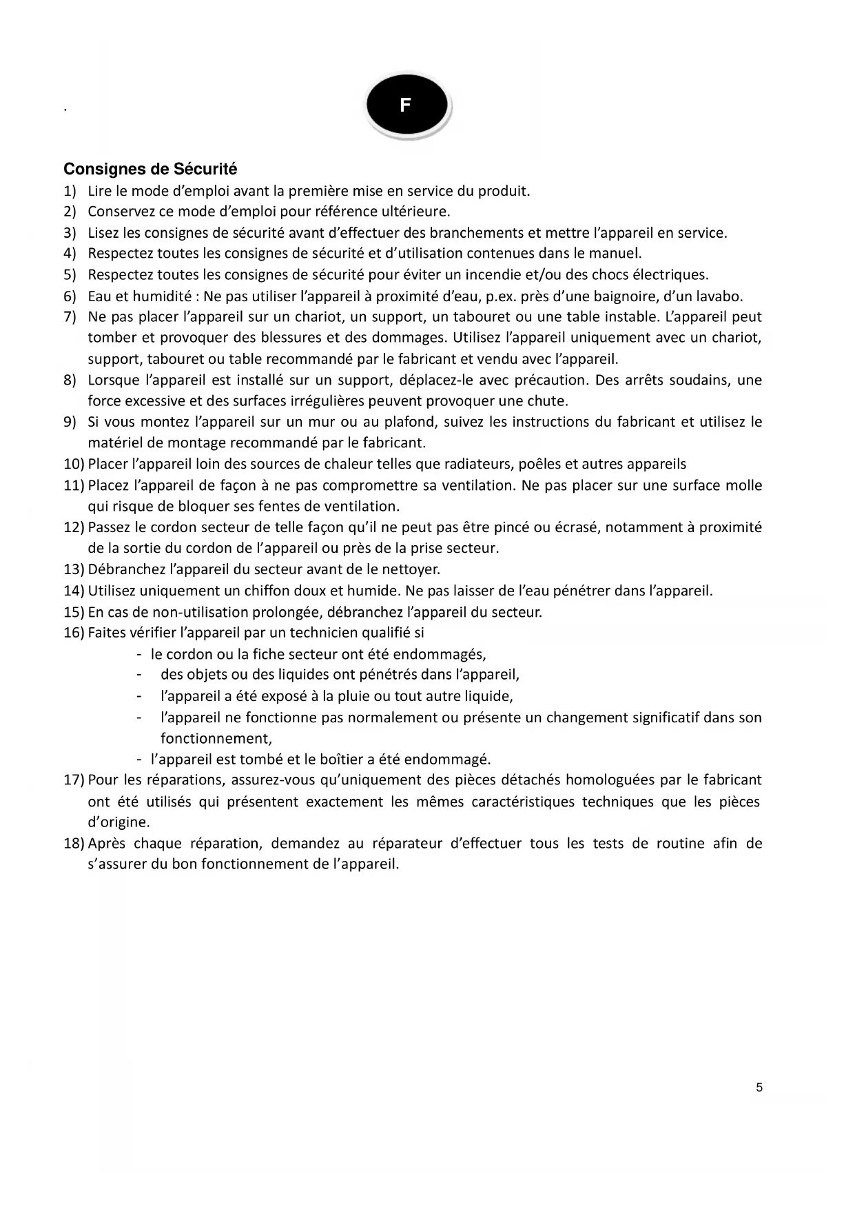 5) Respectez toutes les consignes de sécurité pour éviter un incendie et/ou des chocs électriques.