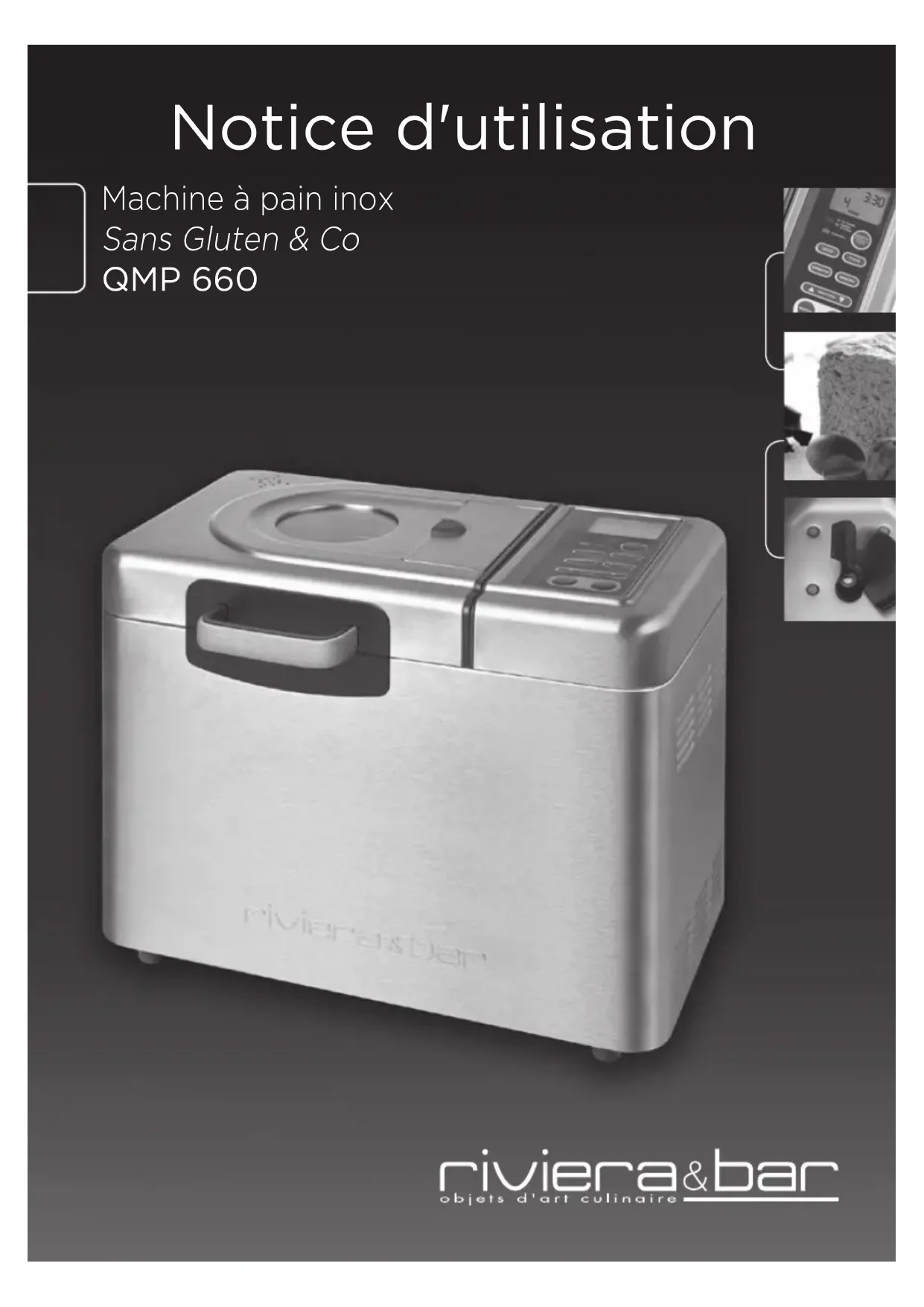 Machine à pain inox Sans Gluten & Co QMP 660 Notice d'utilisation Document et visuels non contractuels - Caractéristiques susceptibles d’être modifiées sans préavis. Mai 2019 - V12 Avec cet appareil, vous avez fait l’acquisition d’un article de qualité, bénéficiant de toute l’expérience de Riviera & Bar dans le domaine de la cuisson. Il répond aux critères de qualité Riviera & Bar : les meilleurs matériaux et composants ont été utilisés pour sa fabrication, et il a été soumis à des contrôles rigoureux. Nous souhaitons que son usage vous apporte entière satisfaction.Sommaire Description du produit 4 Description du panneau de commandes 5 Description des accessoires 5 Recommandations de sécurité générales 6 Recommandations de sécurité particulières 10 Ingrédients 11 Conseils pratiques 12 Avant la première mise en service 14 Mise en service 14 Bibliothèque de recettes personnalisées 20 Fonction spéciale “Mémoire” 24 Sécurités astucieuses 24 Nettoyage et entretien 25 Recommandations générales 27 Guide de contrôle et de dépannage 28 Tableau récapitulatif des temps de préparation des recettes préprogrammées 30 Tableau indicatif des temps de préparation des recettes personnalisées 32 Caractéristiques techniques 33 Environnement 33 Accessoires 33 Garantie 33 3Description du produit