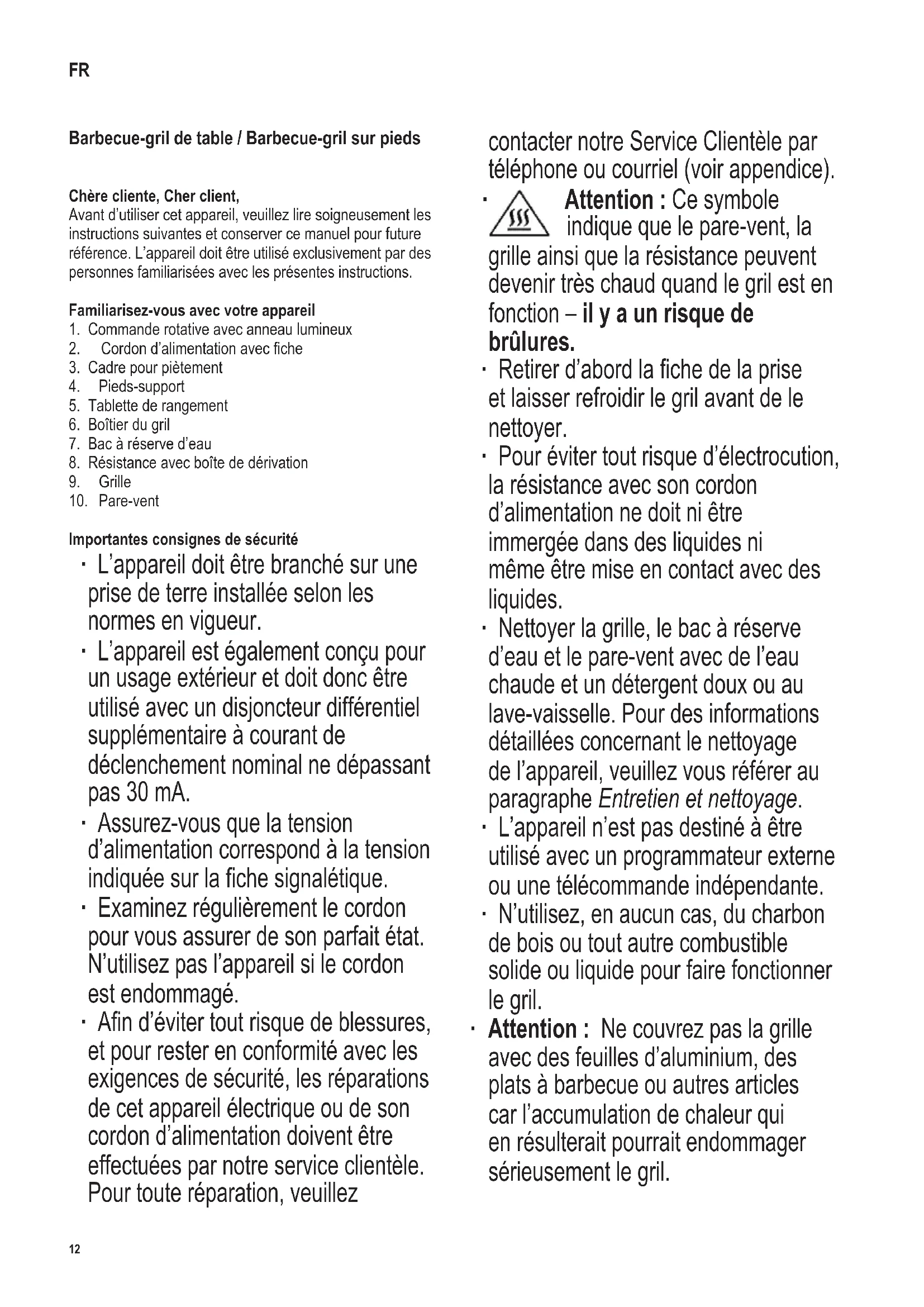 Attention : Ce symbole indique que le pare-vent, la grille ainsi que la résistance peuvent devenir très chaud quand le gril est en fonction – il y a un risque de brûlures. ∙ Retirerd’abordlachedelaprise et laisser refroidir le gril avant de le nettoyer. ∙ Pour éviter tout risque d’électrocution, la résistance avec son cordon d’alimentation ne doit ni être immergée dans des liquides ni même être mise en contact avec des liquides. ∙ Nettoyer la grille, le bac à réserve d’eau et le pare-vent avec de l’eau chaude et un détergent doux ou au lave-vaisselle. Pour des informations détaillées concernant le nettoyage de l’appareil, veuillez vous référer au paragraphe Entretien et nettoyage. ∙ L’appareil n’est pas destiné à être utilisé avec un programmateur externe ou une télécommande indépendante. ∙ N’utilisez, en aucun cas, du charbon de bois ou tout autre combustible solide ou liquide pour faire fonctionner le gril. ∙ Attention : Ne couvrez pas la grille avec des feuilles d’aluminium, des plats à barbecue ou autres articles car l’accumulation de chaleur qui en résulterait pourrait endommager sérieusement le gril. FR13 142 x 208 mm ∙ 900 ml d’eau au maximum peuvent être versés dans le bac à réserve d’eau. ∙ Cet appareil est destiné à être utilisé dans des applications domestiques et analogues telles que : - des coins cuisines réservés au personnel dans des magasins, bureaux et autres environnements professionnels ; - des fermes ; - l’utilisation par les clients des hôtels, motels et autres environnements à caractère résidentiel ; - des environnements de type chambres d’hôtes. ∙ Cet appareil peut être utilisé par des enfants (à partir de 8 ans) et par des personnessouffrantdedéciences physiques, sensorielles ou mentales, ou manquant d’expérience ou de connaissances, s’ils ont été formés à l’utilisation de l’appareil et ont été supervisés, et s’ils en comprennent les dangers et les précautions de sécurité à prendre. ∙ Les enfants ne sont pas autorisés à jouer avec l’appareil. ∙ Les enfants ne doivent pas être autorisés à nettoyer ou entretenir l’appareil à moins d’être supervisés et d’avoir plus de 8 ans. ∙ L’appareil et son cordon d’alimentation doivent être, à tout moment, tenus hors de portée des enfants de moins de 8 ans. ∙ Attention : Tenez les enfants à l’écart des emballages, qui représentent un risque potentiel, par exemple, de suffocation. ∙ Avantd’utilisercetappareil,vériezquetousles accessoires fournis sont en parfait état. Ne l’utilisez pas s’il est tombé sur une surface dure : en effet, des dégâts invisibles peuvent avoir des incidences fâcheuses sur son bon fonctionnement. ∙ Utilisezlegrilexclusivementsurunesurfacerésistante à la chaleur et aux éclaboussures. Celles-ci ne sont pas toujours évitables lors de la cuisson d’aliments à forte teneur en graisse ou en eau. ∙ N’installez pas le gril près d’un mur ou dans un coin et assurez-vousqu’iln’yaaucunmatériauinammableà proximité. ∙ N’oubliez pas que les aliments à forte teneur en graisse ou en eau peuvent prendre feu ; de ce fait, remplissez toujours le bac à réserve d’eau avant l’utilisation. Ne branchez pas le gril sur le secteur avant d’avoir rempli le bac. L’eau aide à refroidir le bac, diminue l’accumulation de fumée et facilite le nettoyage. ∙ Surveillez régulièrement le niveau d’eau. Ajoutez de l’eau en temps voulu en vous assurant qu’elle n’entre pas en contact avec la résistance. Attention : Débranchez le gril de la prise murale avant d’ajouter de l’eau. ∙ Avant d’utiliser le gril, vériez que la résistance s’adapte correctement au bac à réserve d’eau et au boîtier. ∙ Ne laissez à aucun moment le gril fonctionner sans surveillance. ∙ N’oubliez en aucun cas que la résistance et la grille deviennent très chaudes quand le gril est en fonction. Ne touchez pas à la résistance, même éteinte, avant de luiavoirlaissésufsammentdetempspourrefroidir– risques de brûlures graves. ∙ Assurez-vous que le cordon ne touche aucune partie chaude de l’appareil. ∙ Placez le cordon d’alimentation de façon à ce que personne ne risque de trébucher dessus. ∙ Retirer la che de la prise : - avant de remplir d’eau le bac du gril, - après chaque utilisation, - en cas d’éventuelles perturbations pendant l’emploi, - avant chaque nettoyage. ∙ L’utilisation d’une rallonge ou d’un enrouleur entraîne une perte de puissance qui peut aussi faire chauffer le câble. Il est donc nécessaire de dérouler complètement le câble avant utilisation. Assurez-vous que le câble est homologué pour une utilisation en extérieur et pour la puissancespéciée(voirlachesignalétique). ∙ Attention : Ne pas déplacer le gril pendant son utilisation. Avant de déplacer, transporter ou nettoyer le14 142 x 208 mm gril,assurez-vousqu’ilestsufsammentrefroidi.Videz toute eau restante après utilisation. ∙ Ne laissez pas le gril dehors ou dans un endroit dans lequel il sera soumis à des températures extrêmes ou une température élevée. ∙ Le fabricant décline toute responsabilité en cas de dégâts dus à une utilisation erronée ou au non-respect des consignes de sécurité de l’appareil. ∙ Ce produit est conforme à toutes les directives relatives au marquage “CE”. Avant d’utiliser le gril pour la première fois ∙ Eliminez tous les matériaux d’emballage et autocollants de l’appareil. ∙ Nettoyez la grille, le bac à réserve d’eau et le pare-vent avec de l’eau savonneuse chaude ; essuyez ensuite soigneusement. ∙ Assemblez l’appareil tel que décrit dans Préparation de l’appareil. ∙ Faites chauffer le gril à puissance maximale pendant environ 10 minutes sans aliments (voir Grillades). Ceci aura pour effet d’éliminer l’odeur caractéristique accompagnan