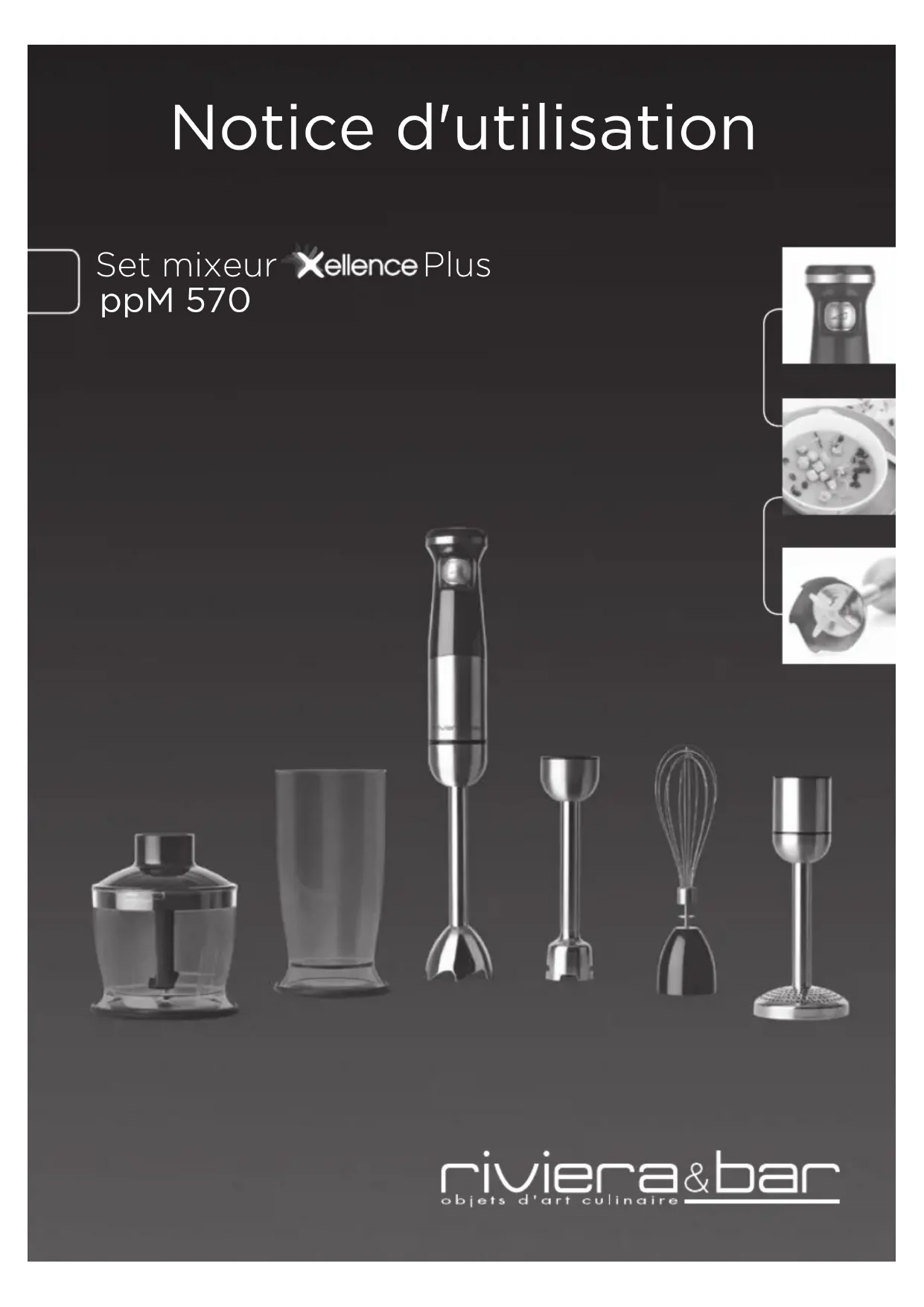 Set mixeur Plus ppM 570 Notice d'utilisationAvec cet appareil, vous avez fait l’acquisition d’un article de qualité, bénéficiant de toute l’expérience de Riviera & Bar dans le domaine de la préparation culinaire. Il répond aux critères de qualité Riviera & Bar : les meilleurs matériaux et composants ont été utilisés pour sa fabrication, et il a été soumis à des contrôles rigoureux. Nous souhaitons que son usage vous apporte entière satisfaction.