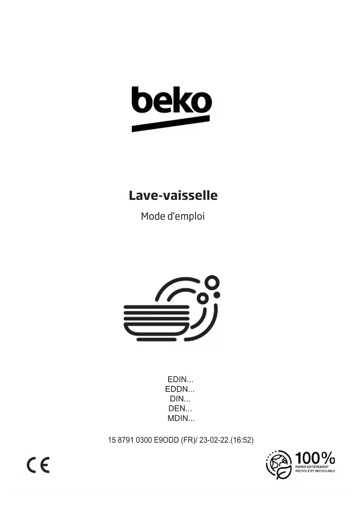 Lave-vaisselle Mode d’emploi 15 8791 0300 E9ODD (FR)/ 23-02-22.(16:52) EDIN... EDDN... DIN... DEN... MDIN...Les symboles suivants sont utilisés dans le manuel d’utilisation et sur l’emballage : Danger pouvant entraîner des blessures voire la mort. AVIS Danger pouvant entraîner des dommages au produit ou à son environnement. Informations importantes ou conseils utiles pour l’utilisation Veuillez lire ce manuel d’utilisateur. Cher client, Veuillez lire le présent manuel d’utilisation avant d’utiliser le produit. Merci d’avoir choisi ce produit Beko. Nous espérons que vous obtiendrez les meilleurs résultats avec notre produit fabriqué à partir d’une technologie de pointe et de matériaux de qualité supérieure. C’est pourquoi nous vous recommandons, avant d’utiliser ce produit, de lire attentivement ce manuel et tous les autres documents fournis. Veillez à bien respecter les consignes et les instructions figurant dans le manuel d’utilisation. Ainsi, vous pouvez vous protéger et protéger votre produit contre les dangers potentiels. Veuillez conserver ce manuel d’utilisateur. Si vous confiez le produit à quelqu’un d’autre, n’oubliez pas de lui remettre également le manuel d’utilisation. Ce produit a été fabriqué conformément aux conditions écologiques les plus récentes.TABLE DES MATIÈRES