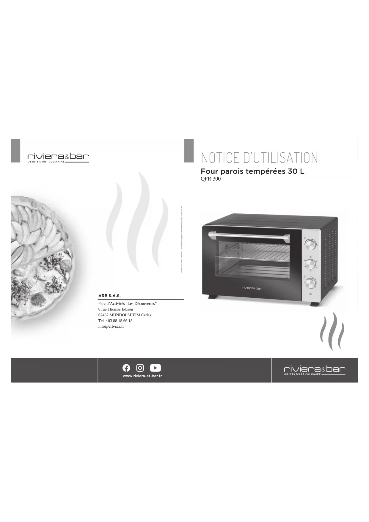 notice d’utilisation ARB S.A.S. Parc d’Activités “Les Découvertes” 8 rue Thomas Edison 67452 MUNDOLSHEIM Cedex Tél. : 03 88 18 66 18 info@arb-sas.fr www.riviera-et-bar.fr Four parois tempérées 30 L QFR 300 Document et visuels non contractuels - Caractéristiques susceptibles d’être modifiées sans préavis. Janvier 2021 - V23