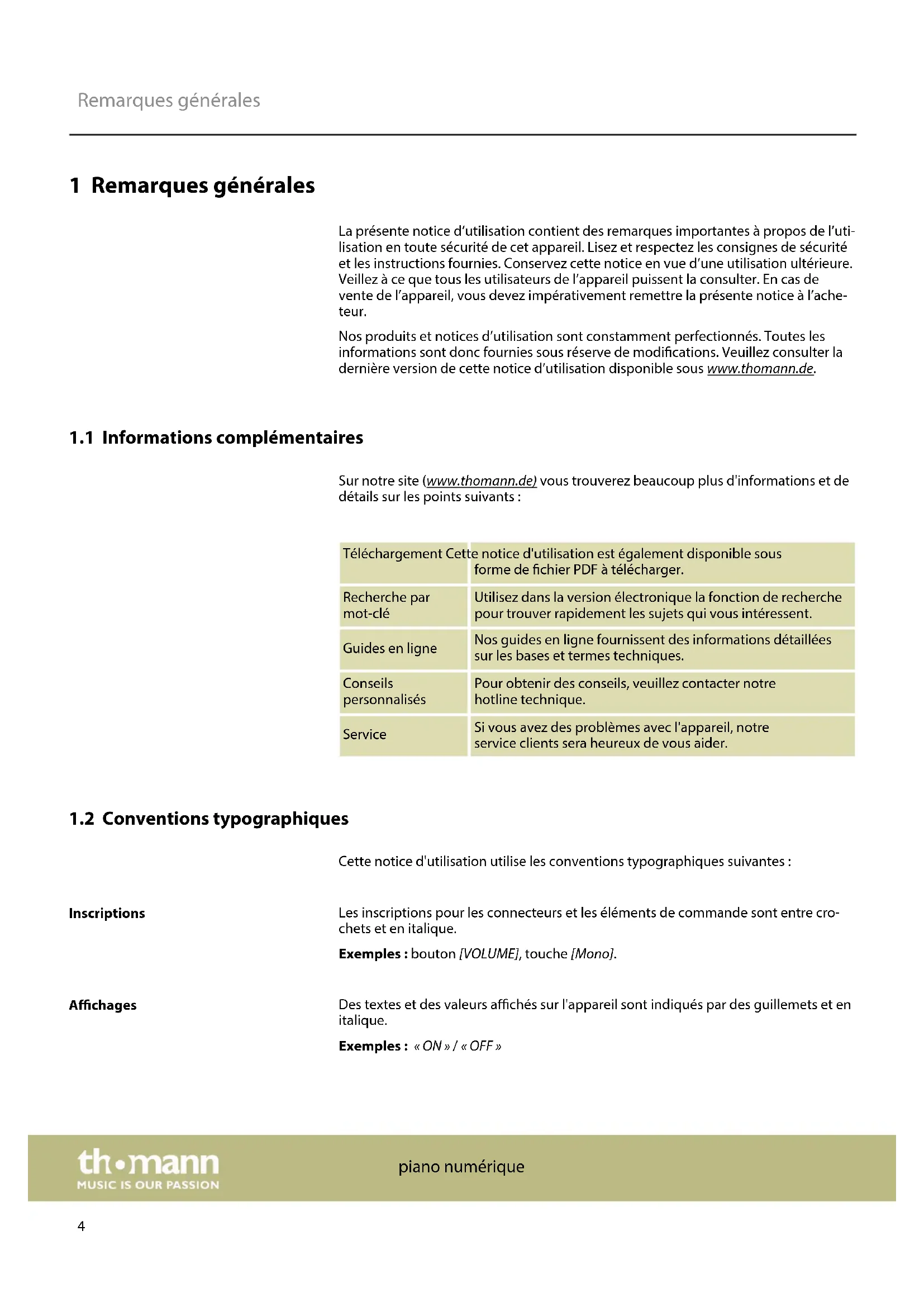 Cette notice d'utilisation utilise les conventions typographiques suivantes : Les inscriptions pour les connecteurs et les éléments de commande sont entre cro‐ chets et en italique. Exemples : bouton [VOLUME], touche [Mono]. Des textes et des valeurs achés sur l'appareil sont indiqués par des guillemets et en italique. Exemples : « ON » / « OFF » Inscriptions Achages Remarques générales