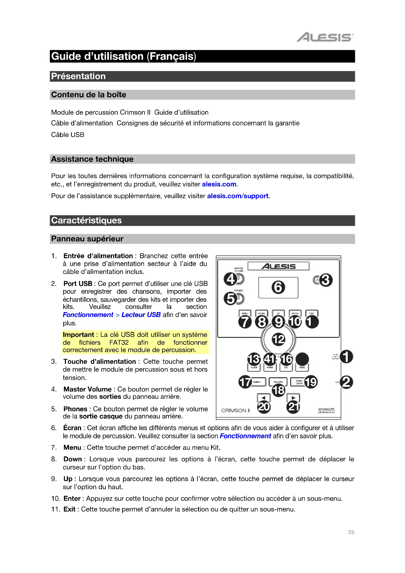 Guide d’utilisation (Français) Présentation Contenu de la boîte Module de percussion Crimson II Guide d’utilisation Câble d’alimentation Consignes de sécurité et informations concernant la garantie Câble USB Assistance technique Pour les toutes dernières informations concernant la configuration système requise, la compatibilité, etc., et l’enregistrement du produit, veuillez visiter alesis.com. Pour de l’assistance supplémentaire, veuillez visiter alesis.com/support. Caractéristiques Panneau supérieur