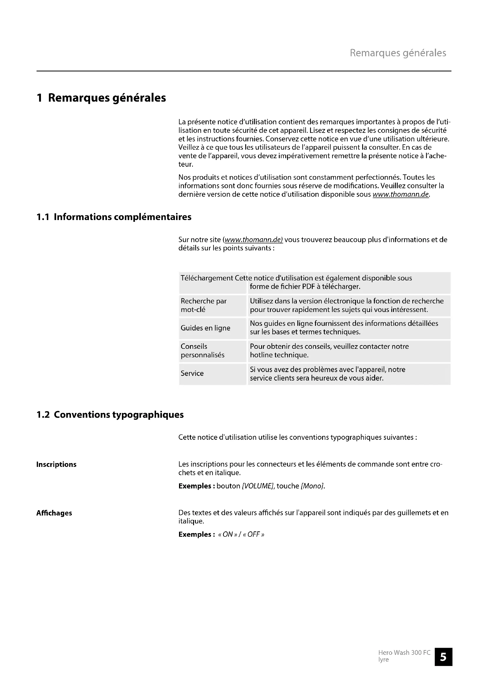 Cette notice d'utilisation utilise les conventions typographiques suivantes : Les inscriptions pour les connecteurs et les éléments de commande sont entre cro‐ chets et en italique. Exemples : bouton [VOLUME], touche [Mono]. Des textes et des valeurs achés sur l'appareil sont indiqués par des guillemets et en italique. Exemples : « ON » / « OFF » Inscriptions Achages Remarques générales Hero Wash 300 FC