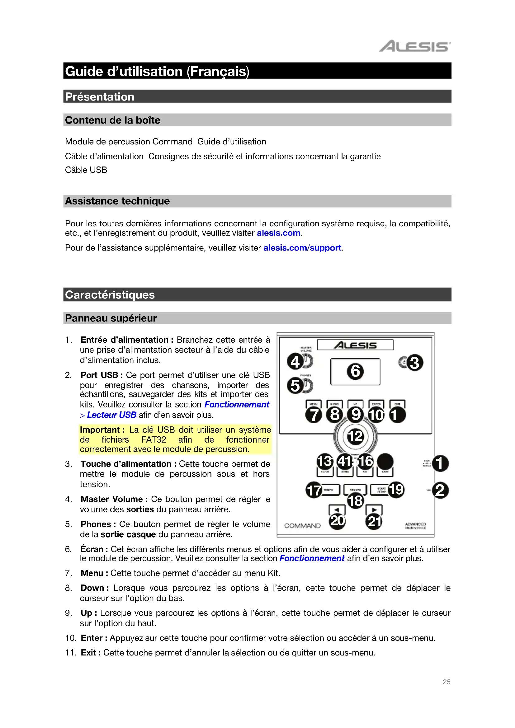 Guide d’utilisation (Français) Présentation Contenu de la boîte Module de percussion Command Guide d’utilisation Câble d’alimentation Consignes de sécurité et informations concernant la garantie Câble USB Assistance technique Pour les toutes dernières informations concernant la configuration système requise, la compatibilité, etc., et l’enregistrement du produit, veuillez visiter alesis.com. Pour de l’assistance supplémentaire, veuillez visiter alesis.com/support.