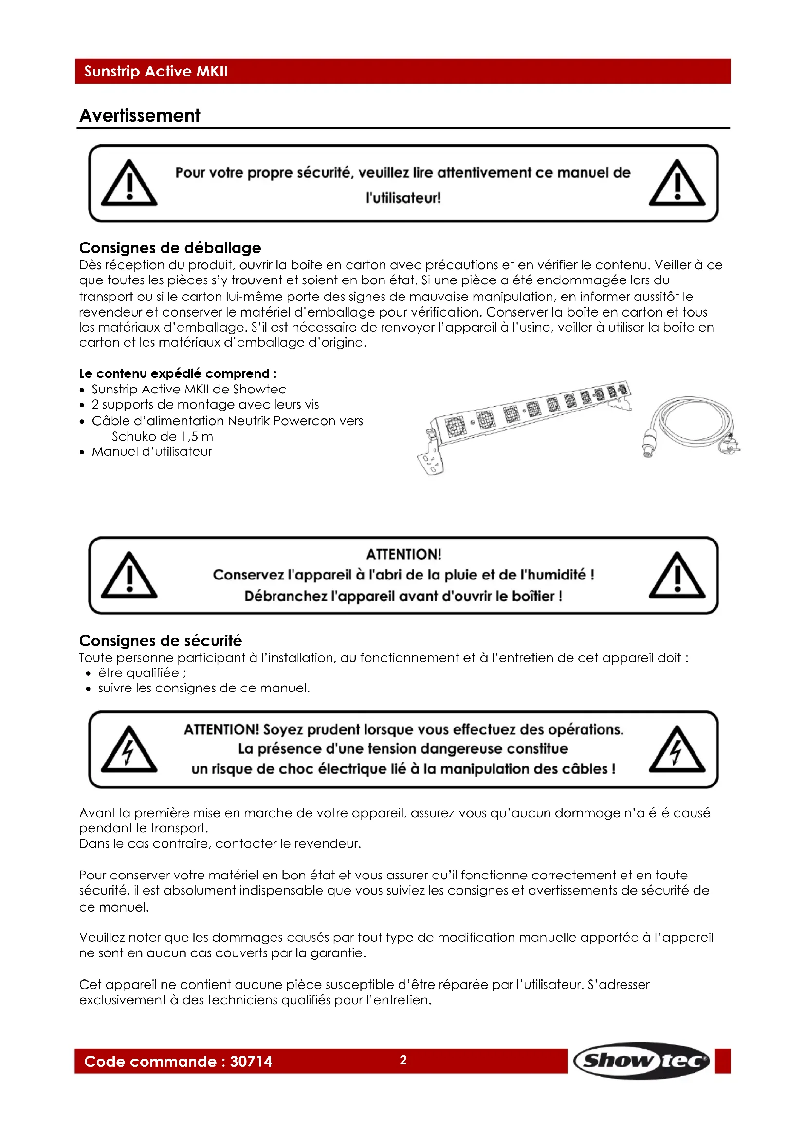 Avant la première mise en marche de votre appareil, assurez-vous qu’aucun dommage n’a été causé pendant le transport. Dans le cas contraire, contacter le revendeur. Pour conserver votre matériel en bon état et vous assurer qu’il fonctionne correctement et en toute sécurité, il est absolument indispensable que vous suiviez les consignes et avertissements de sécurité de ce manuel. Veuillez noter que les dommages causés par tout type de modification manuelle apportée à l’appareil ne sont en aucun cas couverts par la garantie. Cet appareil ne contient aucune pièce susceptible d’être réparée par l’utilisateur. S’adresser exclusivement à des techniciens qualifiés pour l’entretien.3 Code commande : 30714 Sunstrip Active MKII IMPORTANT : Le fabricant ne sera en aucun cas tenu responsable des dommages causés par l’irrespect de ce manuel ni par toutes modifications interdites de l’appareil.