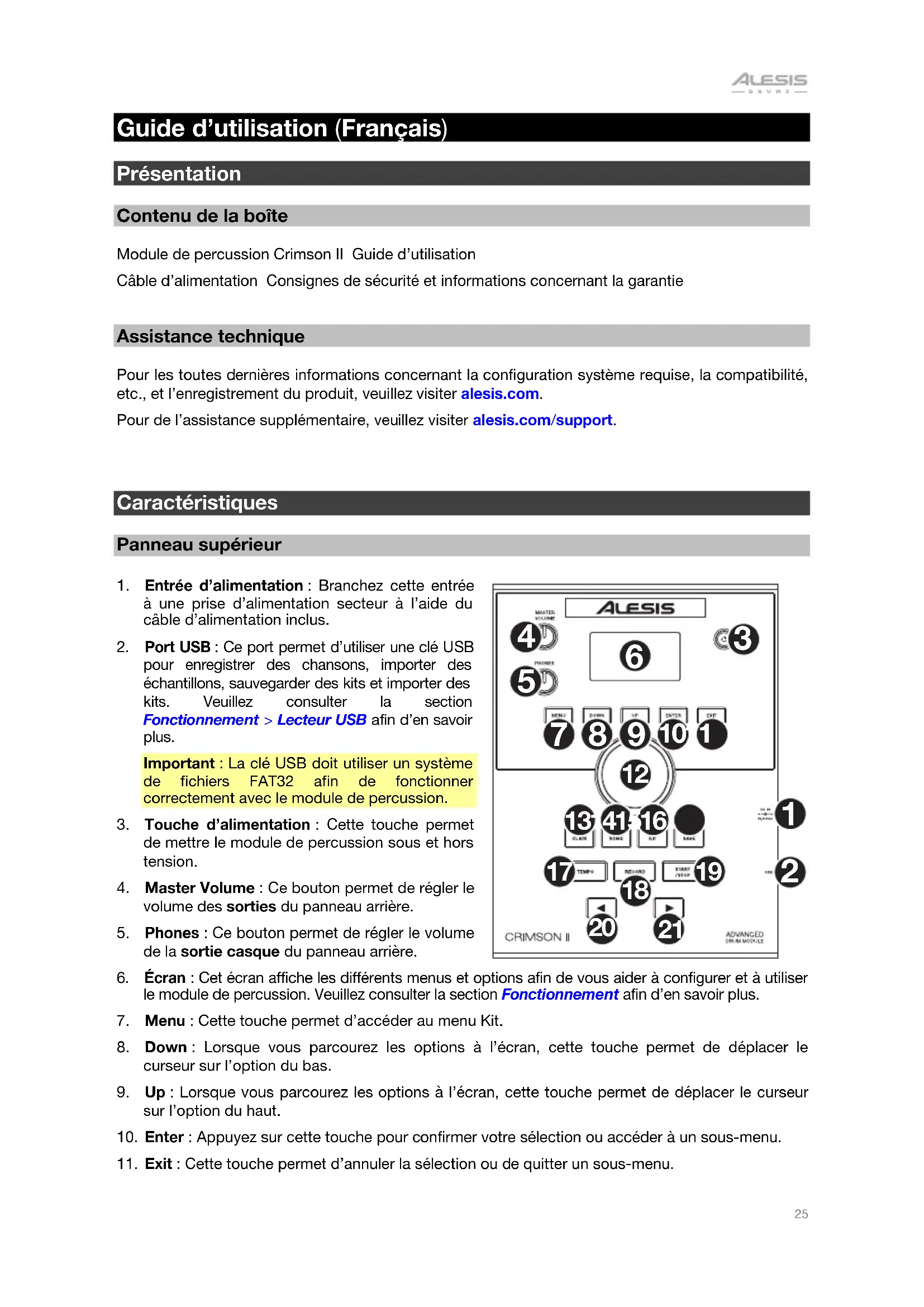 Guide d’utilisation (Français) Présentation Contenu de la boîte Module de percussion Crimson II Guide d’utilisation Câble d’alimentation Consignes de sécurité et informations concernant la garantie Assistance technique Pour les toutes dernières informations concernant la configuration système requise, la compatibilité, etc., et l’enregistrement du produit, veuillez visiter alesis.com. Pour de l’assistance supplémentaire, veuillez visiter alesis.com/support.