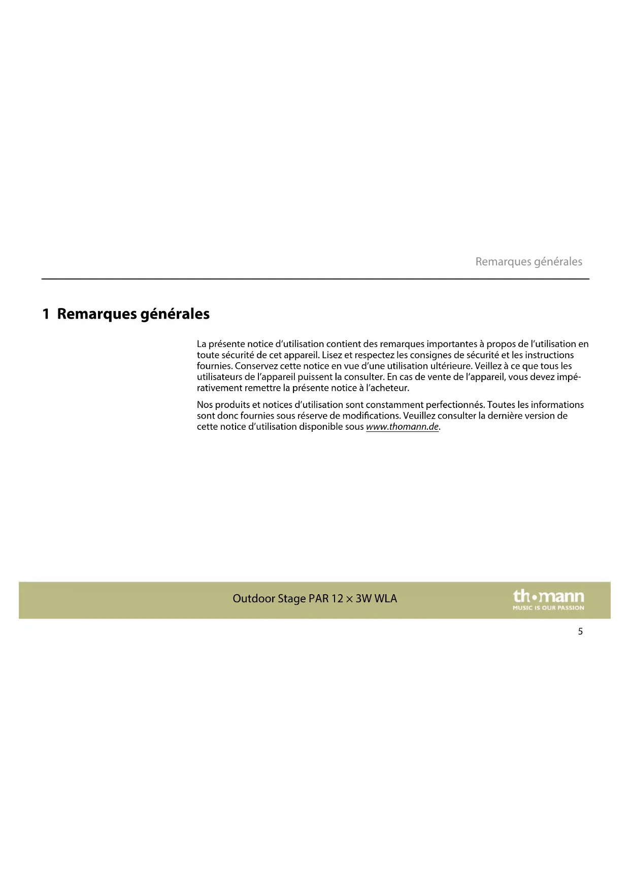 PAR à LED 41 Remarques générales La présente notice d’utilisation contient des remarques importantes à propos de l’utilisation en toute sécurité de cet appareil. Lisez et respectez les consignes de sécurité et les instructions fournies. Conservez cette notice en vue d’une utilisation ultérieure. Veillez à ce que tous les utilisateurs de l’appareil puissent la consulter. En cas de vente de l’appareil, vous devez impé‐ rativement remettre la présente notice à l’acheteur. Nos produits et notices d’utilisation sont constamment perfectionnés. Toutes les informations sont donc fournies sous réserve de modications. Veuillez consulter la dernière version de cette notice d’utilisation disponible sous www.thomann.de. Remarques générales