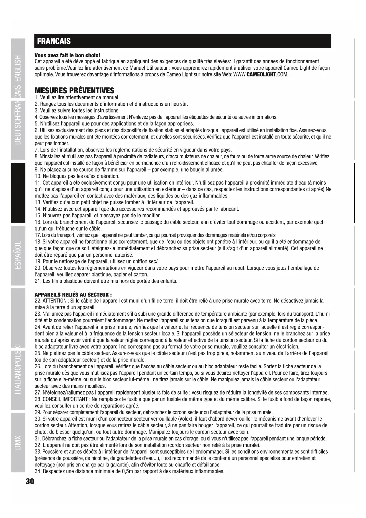 Nos conditions actuelles de garantie et de limitation de responsabilité sont disponibles à l‘adresse suivante : http://www.adamhall.com/media/ shop/downloads/documents/manufacturersdeclarations.pdf. Pour les réparations, veuillez contacter Adam Hall GmbH, Daimlerstraße 9, 61267 Neu Anspach / E-Mail Info@adamhall.com / +49 (0)6081 / 9419-0. TRI ET MISE AUX DÉCHETS CORRECTE DE CE PRODUIT (Valid in the European Union and other European countries with waste separation) (Applicable dans l‘Union Européenne et les autres pays européens pratiquant le tri des déchets) La présence de ce symbole sur le produit ou sur la documentation correspondante indique qu‘en fin de vie, le produit ne doit pas être jeté avec les déchets normaux, afin d‘éviter tout dommage à l‘environnement ou aux personnes consécutive à une élimination non contrôlée des déchets. Séparez-le des aut- res types de déchets et recyclez-le, afin de promouvoir la réutilisation durable des ressources naturelles. Nous conseillons aux utilisateurs non professionnels de contacter le revendeur chez qui ils ont acheté le produit, ou un représentant gouvernemental local, pour plus de détails sur le lieu de collecte et la façon de recycler cet appareil dans le meilleur respect de l‘environnement possible.. Nous invitons les utilisateurs professionnels à contacter leur fournisseur et à vérifier les termes et conditions de leur contrat d‘achat. Ce produit ne doit pas être mélangé à d‘autres déchets commerciaux lors de la collecte.44 DEUTSCHFRANCAIS ESPAÑOL ENGLISH ITALIANO POLSKI DMX ESPAÑOL ¡Gracias por elegir Cameo Light! Este equipo está diseñado y fabricado con los estándares de calidad más exigentes, para garantizar un correcto funcionamiento durante muchos años.Lea atentamente este manual de usuario para poder aprovechar rápidamente toda la funcionalidad de su nuevo producto de Cameo Light. Más información sobre Cameo Light en la web WWW.CAMEOLIGHT.COM.