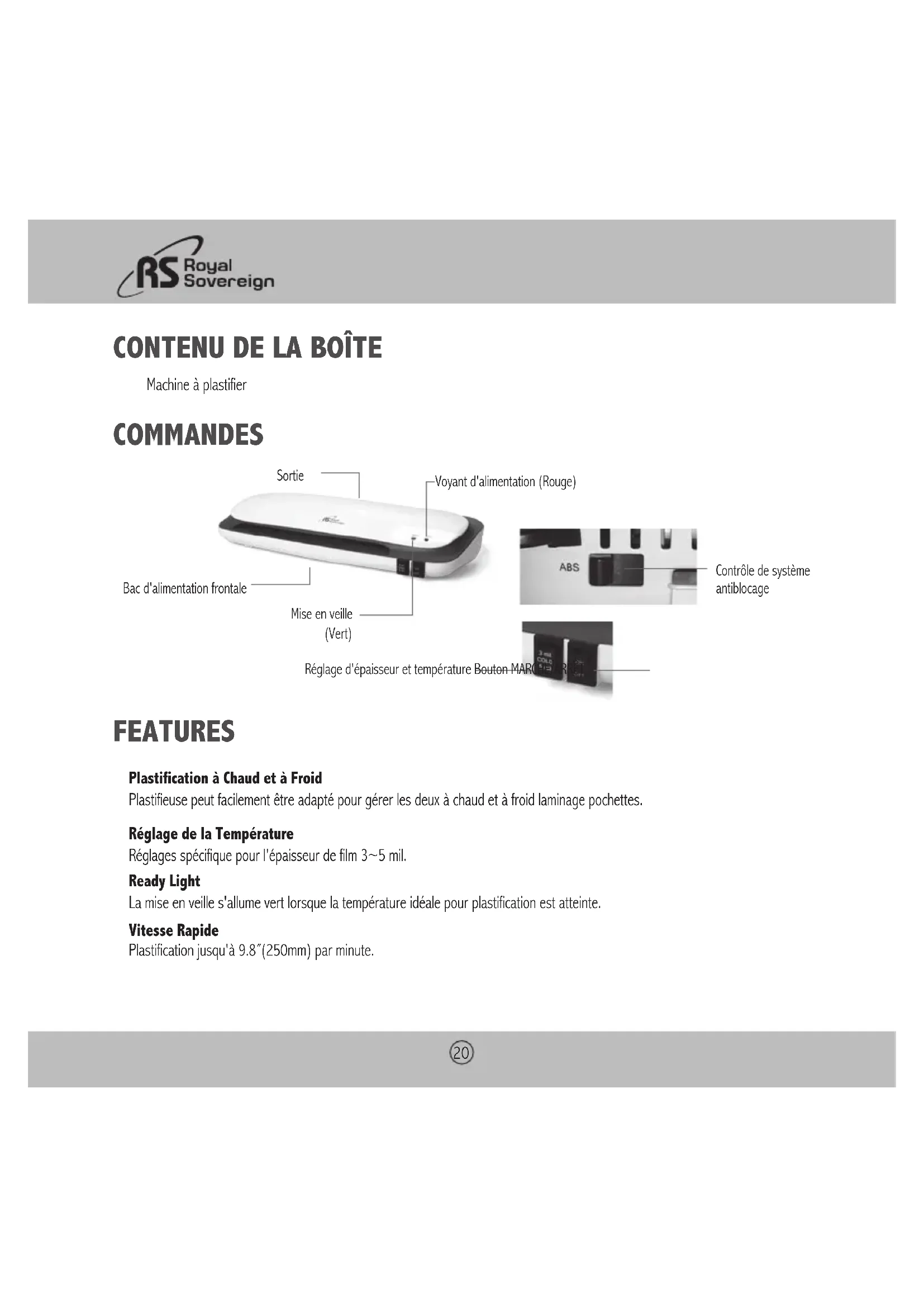 www.royalsovereign.comRoyal Sovereign International, Inc. CS-923/1223 MACHINE À PLASTIFIER Manuel du Propriétaire Lisez et conservez ces instructions pour utilisation ultérieure.Pour enregistrer votre produit, veuillez vous rendre à www.royalsovereign.com – É-U Cliquez sur l’onglet Customer Support (Service à la clientèle) - ensuite Registration (Enregistrement).www.royalsovereign.comPágina en Español 9Page en Français 17 French18 CONSIgNES DE SÉCURITÉ Les recommandations de sécurité décrites dans cette section doivent être lues et comprises avant l’utilisation de cette machine. Lorsque vous utilisez cet appareil, prenez les précautions de sécurité de base suivantes afin de réduire les risques d’incendie, d’électrocution ou de blessure. Gardez ces informations comme référence.
