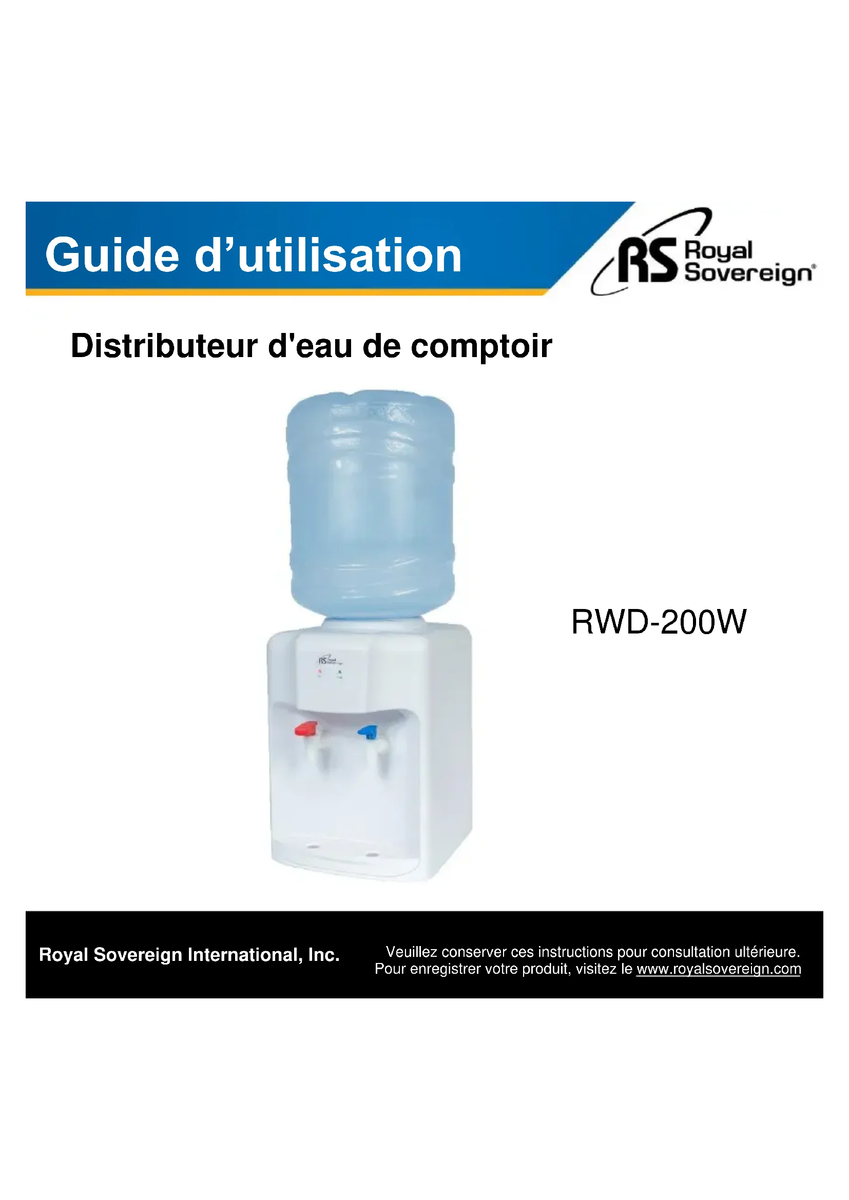www.royalsovereign.ca 8Guide d’utilisation Distributeur d'eau de comptoir Royal Sovereign International, Inc. Veuillez conserver ces instructions pour consultation ultérieure. Pour enregistrer votre produit, visitez le www.royalsovereign.com RWD-200WMerci d'avoir acheté le distributeur d'eau Royal Sovereign, RWD-200W. Ce guide d’utilisation vous fournira des informations de sécurité, des instructions pour une utilisation optimale, ainsi qu'un soin et un entretien appropriés de votre produit. Veuillez lire attentivement ce guide d’utilisation avant d'utiliser l'appareil. CONTENU CONSIGNES DE SÉCURITÉ………................................................................................ SURVOL DU PRODUIT / CONFIGURATION.……………………................................... FONCTIONNEMENT DU PRODUIT…….………………..………….................................ENTRETIEN DESAPPAREILS…………………………………………………………………… DÉPANNAGE................................................................................................................... SPÉCIFICATIONS............................................................................................................ GARANTIE……….............................................................................................................