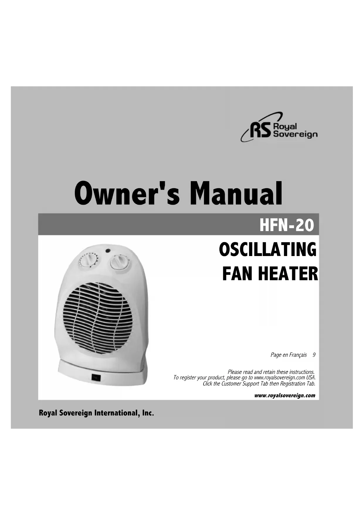 www.royalsovereign.com Royal Sovereign International, Inc. HFN-20 VENTILATEUR DE CHAUFFAGE OSCILLANT Guide de l'utilisateur Veuillez lire et conserver ces instructions.Pour enregistrer votre produit, allez à www.royalsovereign.com États-Unis.Cliquez sur « Customer Support » (service à la clientèle), puis sur l'onglet « Registration » (Enregistrement).www.royalsovereign.comPage en Français 9 HFN-20 E+F manual(10-05-13).indd 跨页 8/8 - 页面 (8, 9)HFN-20 E+F manual(10-05-13).indd 跨页 8/8 - 页面 (8, 9) 2010.5.17 2:48:36 PM2010.5.17 2:48:36 PMVENTILATEUR DE CHAUFFAGE OSCILLANT Modèle Série HFN-20 INTRODUCTION Merci de faire confiance à Royal Sovereign afin de procurer, à vous et votre famille, tout le « confort au foyer » dont vous avez besoin dans votre maison, votre appartement ou au bureau. Ce radiateur peut être installé en quelques minutes seulement et peut être déplacé d'une pièce à l'autre. Il s'agit d'un appareil multifonction permettant le mode chauffage ou ventilation dans une pièce. Le présent guide vous fournira des renseignements inestimables et nécessaires pour bien entretenir votre nouvel appareil. Veuillez prendre un moment pour le lire entièrement. S'il est bien entretenu, votre appareil fonctionnera pendant de nombreuses années sans soucis. HFN-20