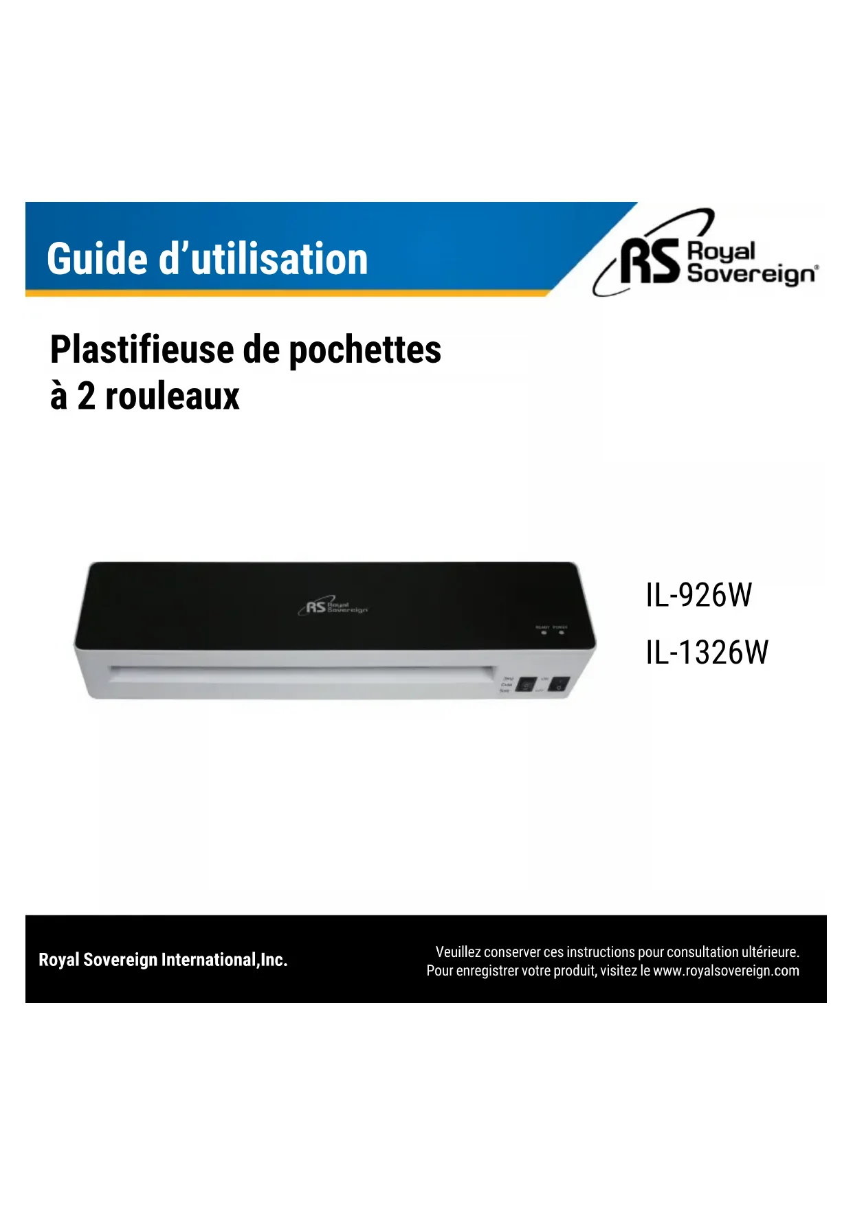 www.royalsovereign.caGuide d’utilisation Plastifieuse de pochettes à 2 rouleaux Royal Sovereign International,Inc. Veuillez conserver ces instructions pour consultation ultérieure. Pour enregistrer votre produit, visitez le www.royalsovereign.com IL-926W IL-1326WMerci d'avoir acheté la plastifieuse de poche à 2 rouleaux Série IL de Royal Sovereign. Ce manuel vous fournira des informations de sécurité, des instructions pour une utilisation optimale, ainsi qu'un entretien et une maintenance appropriés de votre produit. Veuillez lire attentivement ce guide d’utilisation avant d'utiliser l’appareil. CONTENU