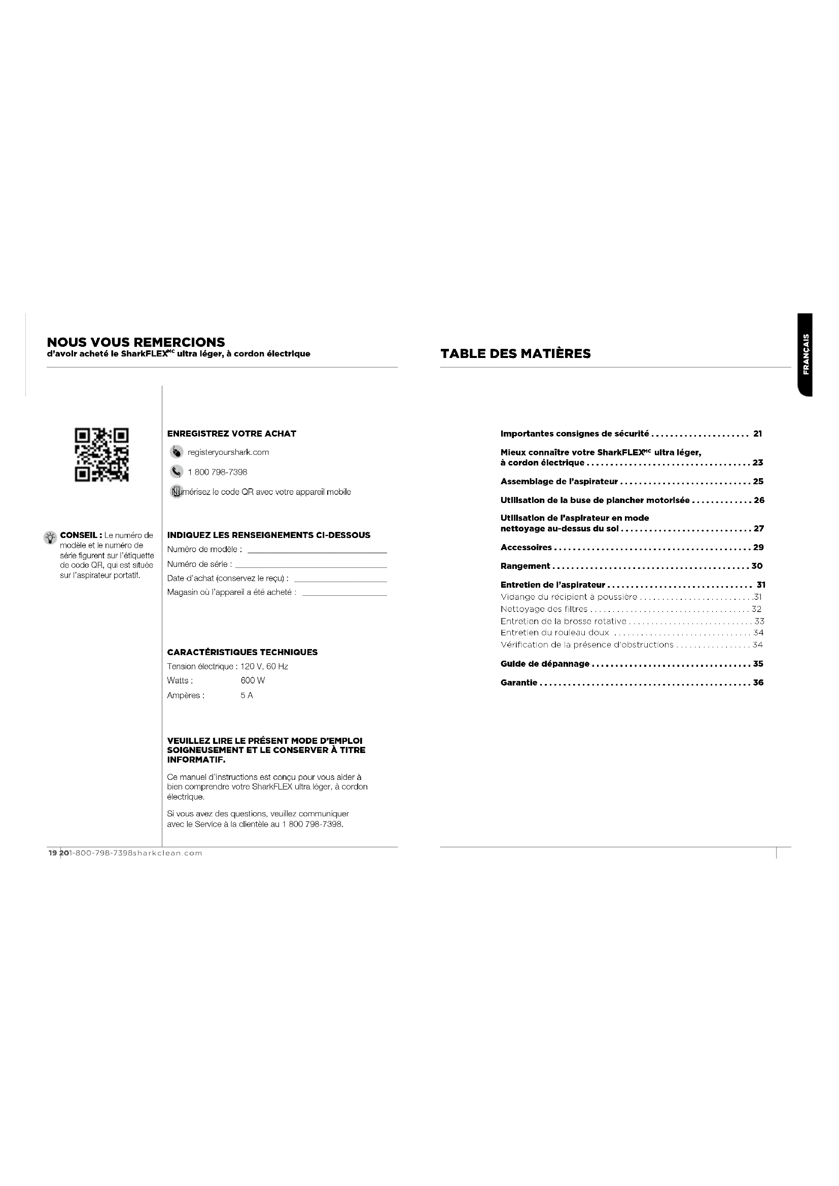 Problèmes avec l’appareil/Comment obtenir un service Si votre appareil ne fonctionne pas comme il le devrait lors d’un usage domestique normal pendant la période de garantie, consultez le site sharkclean.com pour obtenir des informations au sujet de l’entretien du produit que vous pouvez effectuer vous-même. Pour obtenir de l’assistance avec les options du service de la garantie ou avec le produit, veuillez appeler notre service à la clientèle et nos spécialistes de produits au 1800798-7398. Comment présenter une demande de service sous garantie Vous pouvez composer le 1800798-7398 pour demander l’aide d’un spécialiste du service à la clientèle. Veuillez noter que vous devez téléphoner au1800798-7398 pour soumettre une réclamation au titre de la garantie. Les directives d’emballage et de retour de l’appareil vous seront fournies à ce moment-là. Pour connaître les heures du service à la clientèle, consultez le site à l’adresse suivante: sharkclean.com Vous pouvez faire l’achat de pièces de rechange par l’entremise du site sharkclean.com. Pour obtenir plus de renseignements concernant les pièces qualifiées comme pièces d’usure et inusables, veuillez consulter le site sharkclean.com/warranty. Cette garantie vous accorde des droits spécifiques légaux et vous pouvez aussi bénéficier d’autres droits qui varient d’une province ou d’un État à l’autre. Certains États américains ou certaines provinces canadiennes n’acceptent pas l’exclusion ou la limitation de dommages accessoires ou indirects, ce qui fait que cette disposition ne s’appliquerait peut-être pas.37 381-800-798-7398 sharkclean.com ESPAÑOL ÍNDICE GRACIAS por comprar la SharkFLEX™ ultraliviana con cable Instrucciones importantes de seguridad 39 Conozca su SharkFLEX™ ultraliviana con cable 41 Montaje de la aspiradora 43 Uso de la boquilla para piso motorizada 44 Cómo usar su aspiradora en modo “por encima del piso” 45 Accesorios 47 Almacenamiento 48 Mantenimiento de su aspiradora 49 Cómo vaciar el recipiente para el polvo 49 Limpieza de los filtros 50 Mantenimiento del cepillo giratorio 51 Mantenimiento del rodillo suave 52 Control de obstrucciones 52 Guía de solución de problemas 53 Garantía 54