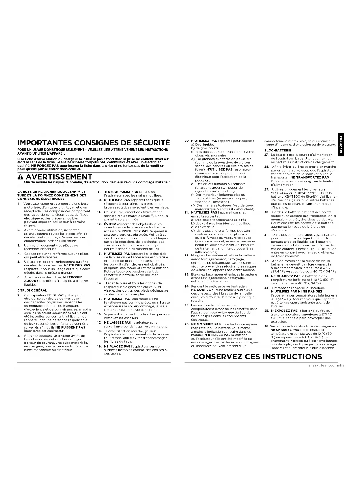 - Assurez-vous que le filtre HEPA soit fermement en place avant d’insérer la batterie. Si vous rencontrez toute autre diculté, veuillez contacter notre service à la clientèle au 1800798-7398.sharkclean.comsharkclean.com La garantie limitée de 2 ans s’applique aux achats eectués auprès de détaillants autorisés de SharkNinja Operating LLC. La garantie s’applique uniquement au premier propriétaire et à la batterie originale et elle n’est pas transférable. SharkNinja garantit le batterie contre toute défectuosité de matériau ou de main-d’œuvre pour une période de 2ans à compter de la date d’achat, dans le cadre d’un usage domestique normal et si le produit est entretenu conformément aux exigences décrites dans ce mode d’emploi, sujet aux conditions et aux exclusions ci-dessous. Que couvre la garantie?