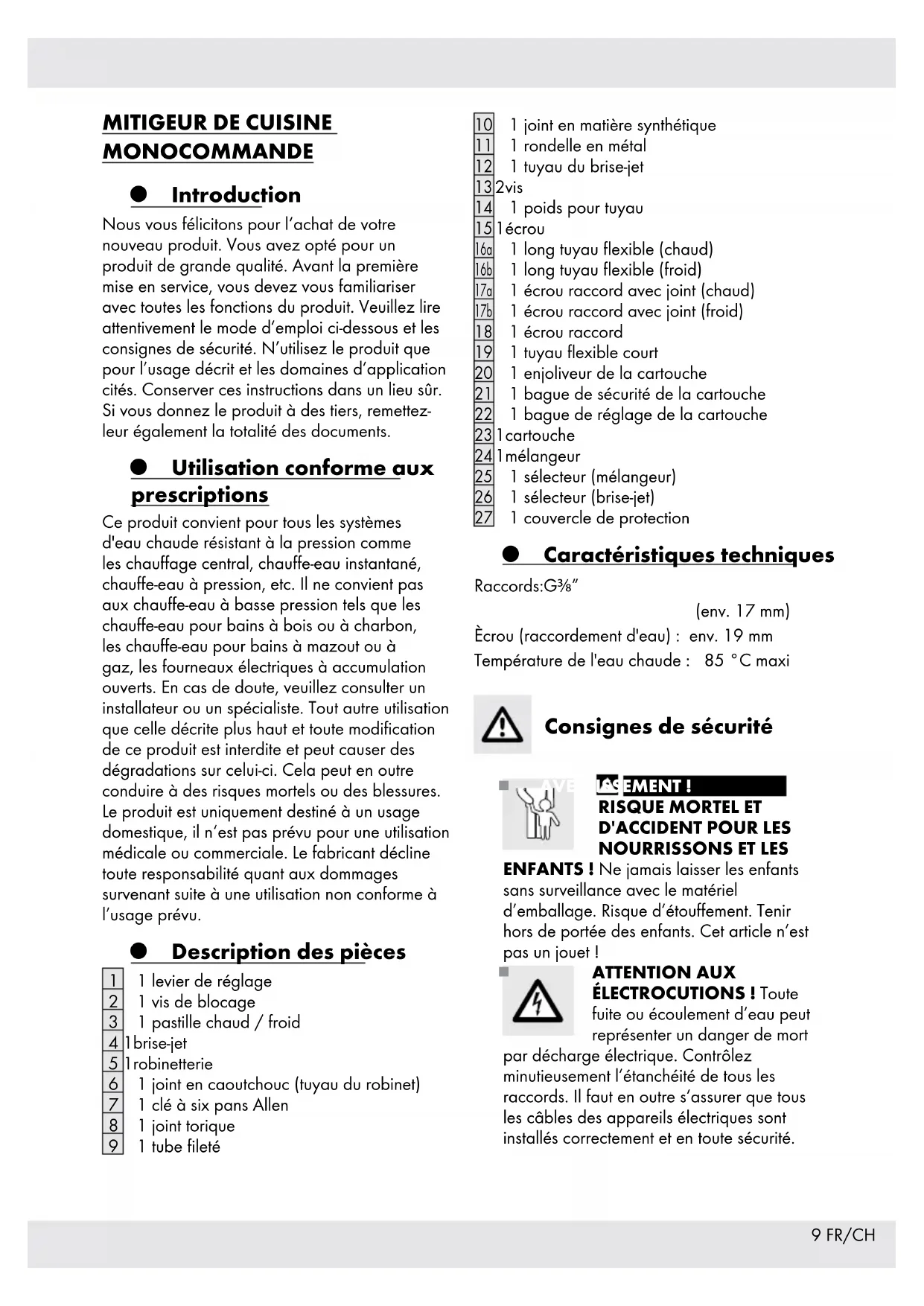 1 couvercle de protection Caractéristiques techniques Raccords : G3⁄8” (env. 17 mm) Ècrou (raccordement d'eau) : env. 19 mm Température de l'eau chaude : 85 °C maxi Consignes de sécurité AVERTISSEMENT !