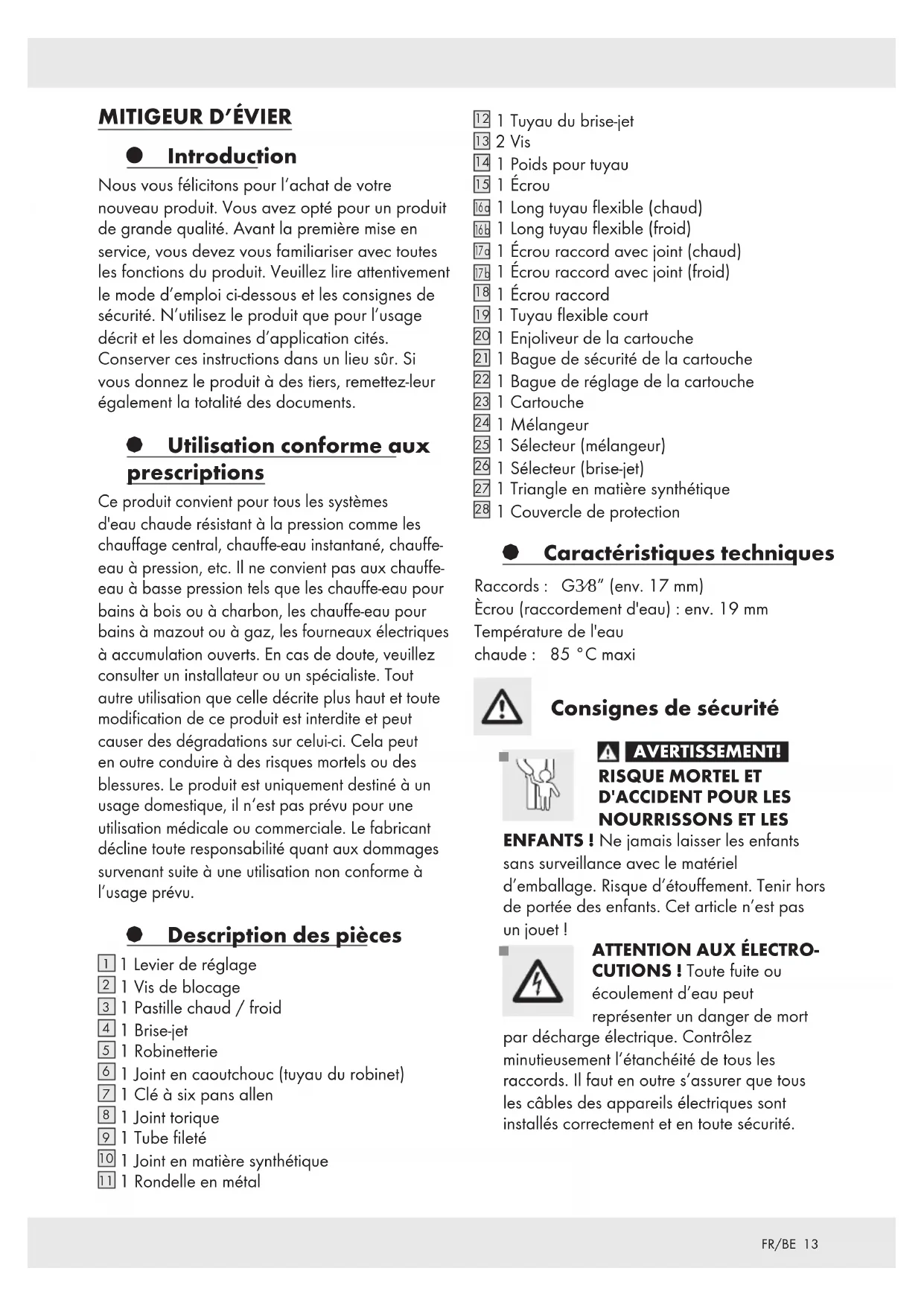 à intervalles réguliers, dehors et éliminez les résidus de calcaire ou corps étrangers. Le non-respect des instructions d‘entretien peut entraîner des dommages sur la surface. Il est alors impossible de faire valoir ses droits de garantie. § Mise au rebut L’emballage se compose de matières recyclables pouvant être mises au rebut dans les déchetteries locales. Votre mairie ou votre municipalité vous renseigneront sur les possibilités de mise au rebut des produits usagés.16 FR/BE § Informations § Potabilité de l’eau du robinet Informez-vous auprès des autorités locales sur la potabilité de l’eau dans votre ville / commune. D’une façon générale, pour la potabilité de l’eau du robinet, nous recommandons : Laissez couler l’eau un bref moment si elle a stagné plus de quatre heures dans les tuyaux. N’utilisez pas l’eau stagnante pour préparer les repas et les boissons, et surtout pas dans la préparation des aliments pour nourrissons. Dans le cas contraire, il existe des risques pour la santé. L’eau qui sort du robinet est bonne lorsqu’elle est nettement plus fraîche que l’eau stagnante. N’utilisez aucune eau stagnante provenant de conduites revêtues de chrome pour l’alimentation et / ou la toilette si vous êtes allergique au nickel. Une telle eau peut contenir une grande quantité de nickel et provoquer des réactions allergiques. N’utilisez pas d’eau potable venant de tuyauteries de plomb pour la préparation d’aliments pour nourrisson et / ou pendant la grossesse pour la préparation des aliments. Le plomb pénètre dans l’eau potable, ce qui est particulièrement dangereux pour la santé des nourrissons et des jeunes enfants. § Garantie Le produit a été fabriqué selon des critères de qualité stricts et contrôlé consciencieusement avant sa livraison. En cas de défaillance, vous êtes en droit de retourner ce produit au vendeur. La présente garantie ne constitue pas une restriction de vos droits légaux. Ce produit bénéficie d‘une garantie de 5 ans à compter de sa date d’achat. La durée de garantie débute à la date d’achat. Veuillez conserver le ticket de caisse original. Il fera office de preuve d’achat. Si un problème matériel ou de fabrication devait survenir dans 5 ans suivant la date d‘achat de ce produit, nous assurons à notre discrétion la réparation ou le remplacement du produit sans frais supplémentaires. La garantie prend fin si le produit est endommagé suite à une utilisation inappropriée ou à un entretien défaillant. La garantie couvre les vices matériels et de fabrication. Cette garantie ne s’étend ni aux pièces du produit soumises à une usure normale (p. ex. des piles) et qui, par conséquent, peuvent être considérées comme des pièces d’usure, ni aux dommages sur des composants fragiles, comme des interrupteurs, des batteries ou des éléments fabriqués en verre.17 NL/BE MENGKRAAN Inleiding Hartelijk gefeliciteerd met de aankoop van uw nieuwe product. U hebt voor een hoogwaardig product gekozen. Maak u voor de eerste ingebruikname vertrouwd met het product. Lees hiervoor aandachtig de volgende gebruiksaanwijzing en de veiligheidsvoorschriften. Gebruik het product alleen zoals beschreven en voor de aangegeven toepassingsgebieden. Bewaar deze gebruiksaanwijzing op een veilige plek. Geef, wanneer u het product doorgeeft aan derden, ook alle documenten mee. § Beoogd gebruik Dit product is geschikt voor alle drukvaste warmwatersystemen zoals centrale verwarming, geisers, drukboilers, etc. Het product is niet geschikt voor met lage druk werkende warmwatersystemen zoals hout-, kolen-, olie- of gasbadboilers of open elektrisch verwarmde watertanks. Neem in geval van twijfel contact op met een installateur of een deskundige. Een ander gebruik dan bovenbeschreven of een verandering aan het product is niet toegestaan en leidt tot schade. Bovendien kan dit leiden tot ander levensgevaar en letsel. Het product is alleen bedoeld voor eigen gebruik, niet voor medische of commerciële doeleinden. De fabrikant is niet aansprakelijk voor schade die terug te voeren is op ondeskundig gebruik. § Onderdelenbeschrijving
