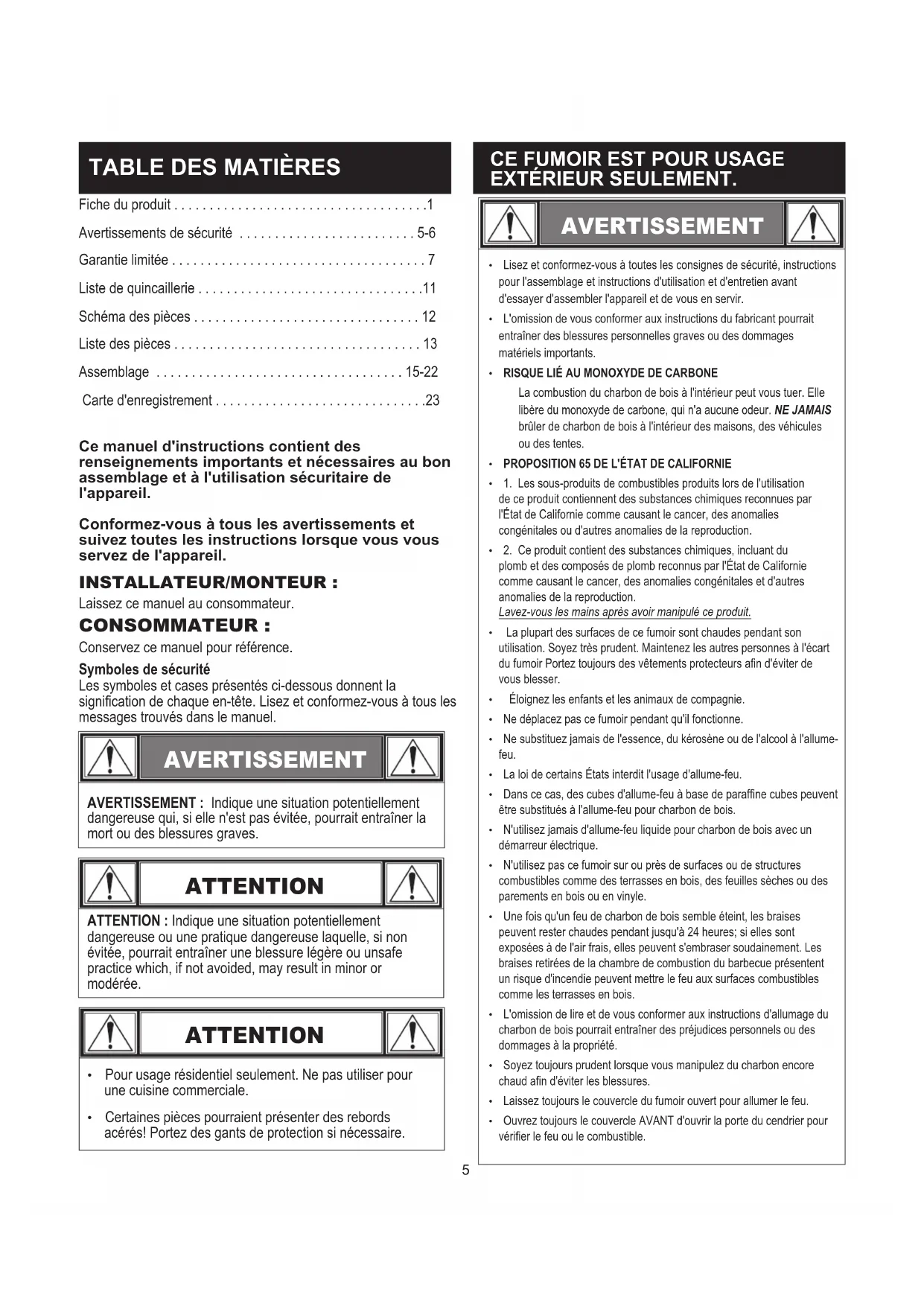 - Lisez et conformez-vous à toutes les consignes de sécurité, instructions pour l'assemblage et instructions d'utilisation et d'entretien avant d'essayer d'assembler l'appareil et de vous en servir. • L'omission de vous conformer aux instructions du fabricant pourrait entraîner des blessures personnelles graves ou des dommages matériels importants.• RISQUE LIÉ AU MONOXYDE DE CARBONELa combustion du charbon de bois à l'intérieur peut vous tuer. Elle libère du monoxyde de carbone, qui n'a aucune odeur. NE JAMAIS brûler de charbon de bois à l'intérieur des maisons, des véhicules ou des tentes.• PROPOSITION 65 DE L'ÉTAT DE CALIFORNIE• 1. Les sous-produits de combustibles produits lors de l'utilisation de ce produit contiennent des substances chimiques reconnues par l'État de Californie comme causant le cancer, des anomalies congénitales ou d'autres anomalies de la reproduction.• 2. Ce produit contient des substances chimiques, incluant du plomb et des composés de plomb reconnus par l'État de Californie comme causant le cancer, des anomalies congénitales et d'autres anomalies de la reproduction.Lavez-vous les mains après avoir manipulé ce produit.• La plupart des surfaces de ce fumoir sont chaudes pendant son utilisation. Soyez très prudent. Maintenez les autres personnes à l'écart du fumoir Portez toujours des vêtements protecteurs afin d'éviter de vous blesser.• Éloignez les enfants et les animaux de compagnie. • Ne déplacez pas ce fumoir pendant qu'il fonctionne. • Ne substituez jamais de l'essence, du kérosène ou de l'alcool à l'allume- feu.