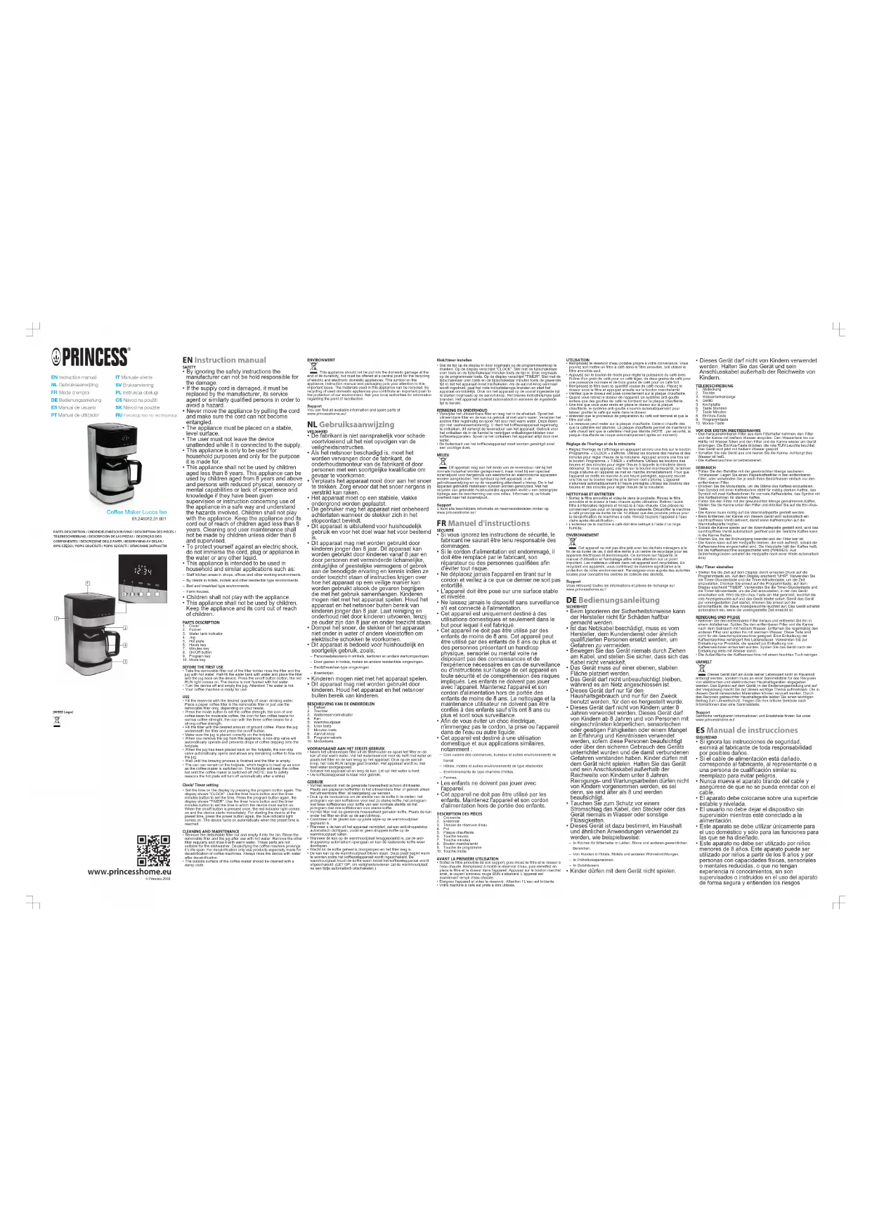 - L’extérieur de la machine à café doit être nettoyé à l’aide d’un linge humide. ENVIRONNEMENT Cet appareil ne doit pas être jeté avec les déchets ménagers à la fin de sa durée de vie, il doit être remis à un centre de recyclage pour les appareils électriques et électroniques. Ce symbole sur l'appareil, le manuel d'utilisation et l'emballage attire votre attention sur un point important. Les matériaux utilisés dans cet appareil sont recyclables. En recyclant vos appareils, vous contribuez de manière significative à la protection de notre environnement. Renseignez-vous auprès des autorités locales pour connaître les centres de collecte des déchets. Support Vous retrouvez toutes les informations et pièces de rechange sur www.princesshome.eu! DEBedienungsanleitung SICHERHEIT