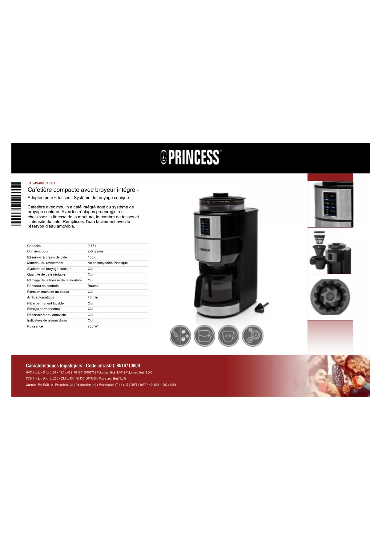 Cafetière compacte avec broyeur intégré - Adaptée pour 6 tasses - Système de broyage conique Cafetière avec moulin à café intégré doté du système de broyage conique. Avec les réglages préenregistrés, choisissez la finesse de la mouture, le nombre de tasses et l'intensité du café. Remplissez l'eau facilement avec le réservoir d'eau amovible. Capacité Convient pour Réservoir à grains de café Matériau du revêtement Système de broyage conique Quantité de café réglable Réglage de la finesse de la mouture Panneau de contrôle Fonction maintien au chaud Arrêt automatique Filtre permanent lavable Filtre(s) permanent(s) Réservoir à eau amovible Indicateur de niveau d'eau Puissance 0,75 l 2-6 tasses 100 g Acier inoxydable Plastique Oui Oui Oui Bouton Oui 40 min Oui Oui Oui Oui 750 W Quantité: Par PCB : 2 | Par palette: 34 | Palettisation (Hi) x Palettisation (Ti): 1 x 17 | 20FT / 40FT / HQ: 832 / 1200 / 1450 PCB: H x L x D (cm): 62,6 x 21,6 x 45 | : 8713016049780 | Poids brut (kg): 9,657 UVC: H x L x D (cm): 30 x 19,4 x 42 | : 8713016049773 | Poids brut (kg): 4,401 | Poids ned (kg): 3,546 Caractéristiques logistiques - Code intrastat: 8516710000