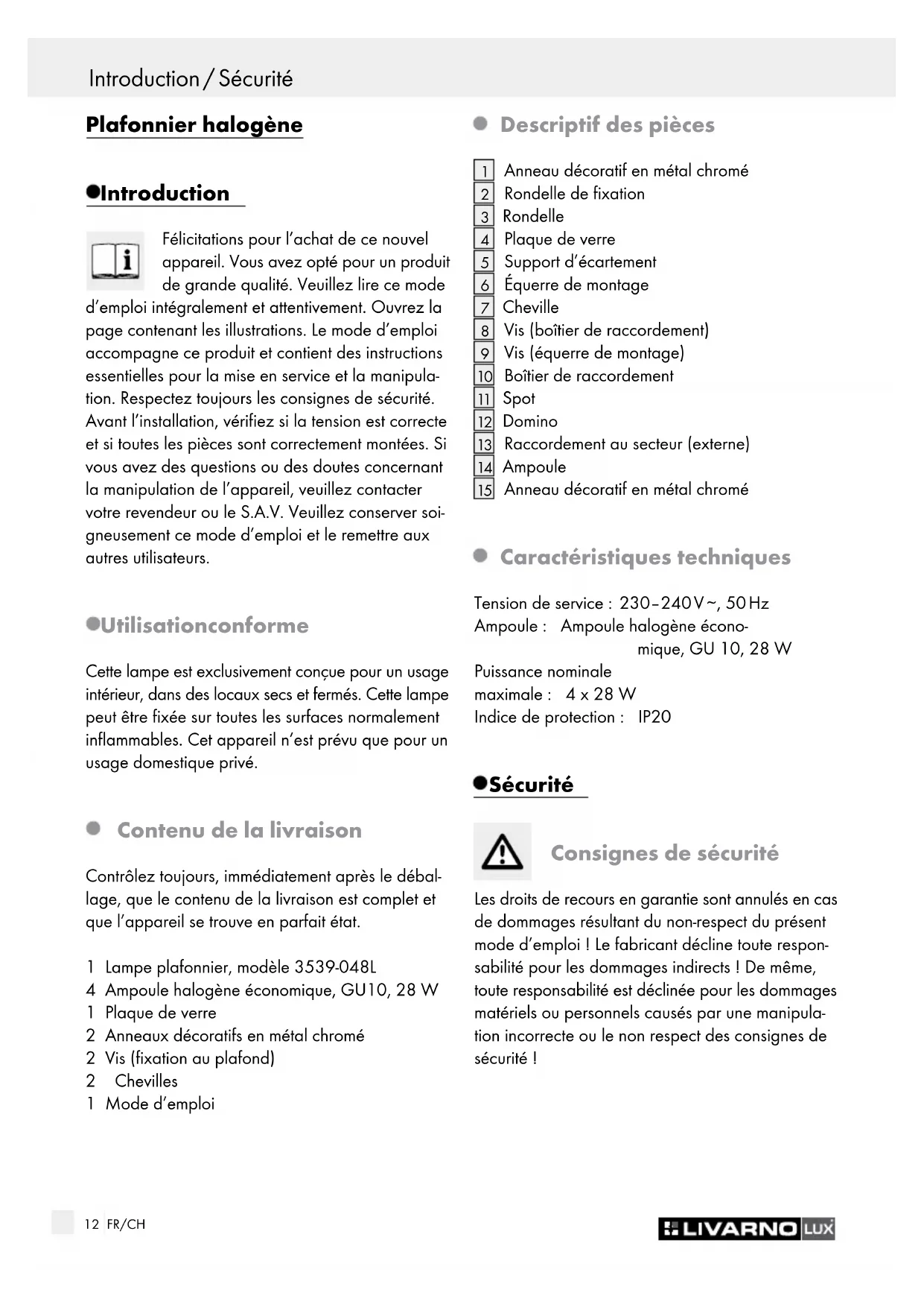 Anneau décoratif en métal chromé Caractéristiques techniques Tension de service: 230–240 V ∼, 50 Hz Ampoule: Ampoule halogène écono- mique, GU 10, 28 W Puissance nominale maximale: 4 x 28 W Indice de protection: IP20 Sécurité Consignes de sécurité Les droits de recours en garantie sont annulés en cas de dommages résultant du non-respect du présent mode d’emploi! Le fabricant décline toute respon- sabilité pour les dommages indirects! De même, toute responsabilité est déclinée pour les dommages matériels ou personnels causés par une manipula- tion incorrecte ou le non respect des consignes de sécurité! Introduction / Sécurité13 FR/CH Prévention de risques mortels par électrocution L’installation électrique doit être effectuée par un électricien ou par une personne dûment formée à cet effet. Avant chaque raccordement au secteur, contrô- lez le bon état de la lampe et du câble d’ali- mentation. N’utilisez jamais la lampe si vous constatez le moindre endommagement. ATTENTION! Des câbles secteur endommagés impliquent un danger de mort par électrocution. En cas d’endommagements, de réparations ou d’autres problèmes, veuillez contacter le service après-vente ou un électricien. Avant le montage, retirez le fusible ou coupez le disjoncteur de la boîte à fusibles (position 0). Avant le montage, vérifiez que la tension secteur corresponde à la tension de service requise de la lampe (230–240 V ∼). Évitez impérativement tout contact de la lampe avec de l’eau ou d’autres liquides. N’ouvrez jamais les composants électriques, ni n’insérez des objets quelconques dans ceux-ci. De telles interventions impliquent un danger de mort par électrocution. N’installez jamais la lampe sur un support humide ou conducteur de courant! Prévention de risque d’incendies et de blessures RISQUE DE BLESSURES! Immédiatement après le déballage, vérifiez le parfait état de chaque ampoule et verre de lampe. Ne montez pas la lampe avec des ampoules et / ou des verres de lampe défectueux(-ses). Dans ce cas, veuillez contacter le service après-vente pour faire remplacer une pièce défectueuse. RISQUE DE BRÛLURES! Afin d’éviter toute brûlure, vérifiez que la lampe est éteinte et suffisamment froide avant de la manipuler. L’ampoule dégage une forte chaleur au niveau de la tête de la lampe. Laissez refroidir la lampe complètement. Remplacez immédiatement toute ampoule défec- tueuse par une neuve. Avant de remplacer l’ampoule, retirez toujours le fusible en premier lieu ou coupez le disjoncteur de la boîte à fusible. 0,5 m RISQUE D’INCENDIE! La lampe doit être montée à une distance d’au moins 0,5 m des objets illumi- nés. Un dégagement de chaleur excessif peut provoquer un incendie. Ne laissez pas la lampe ou le matériel d’em- ballage traîner sans surveillance. Les films et les sachets en plastique, les éléments en matières synthétiques, etc. peuvent devenir des jouets dangereux dans les mains des enfants. Attitude à adopter Utilisez uniquement une ampoule halogène économique 220–240 V∼ avec un culot G10 et une puissance maximale de 28watts. Montez la lampe de telle sorte qu’elle soit pro- tégée de l’humidité, du vent et des saletés. Préparez soigneusement le montage et effec- tuez-le sans précipitation. Préparez toutes les pièces détachées et l’outillage ou le matériel requis et posez-les à portée de main. Soyez toujours vigilant! Faites toujours atten- tion à ce que vous faites et agissez raisonna- blement. N’effectuez jamais le montage de la lampe si vous n’êtes pas concentré ou si vous vous sentez mal. Préparation Outils et matériel nécessaires Les outils et matériels indiqués ne sont pas compris dans le contenu de la livraison. Il s’agit là de don- nées et de valeurs indicatives vous permettant de vous orienter. Les caractéristiques du matériel dépendent des conditions spécifiques sur place. Sécurité / Préparation14 FR/CH - Crayon / outil marqueur - Détecteur de tension - Tournevis - Perceuse - Foret (env. ø6 mm) - Pince coupante de côté - Échelle Avant l’installation Important: Le raccordement électrique doit être réalisé par un électricien professionnel ou une per- sonne formée à cela. Cette personne doit être infor- mée des caractéristiques de la lampe et des spécifications de raccordement. Avant l’installation, prenez bien connaissance de toutes les consignes et figures indiquées dans le présent mode d’emploi et familiarisez- vous avec la lampe. Avant l’installation, vérifiez l’absence de tension au niveau du câble auquel doit être raccordé la lampe. Pour ce faire, retirez le fusible ou coupez le disjoncteur de la boîte à fusible (position 0). Vérifiez l’absence de tension à l’aide d’un détecteur de tension. Montage Montez les anneaux décoratifs en plastique chromé