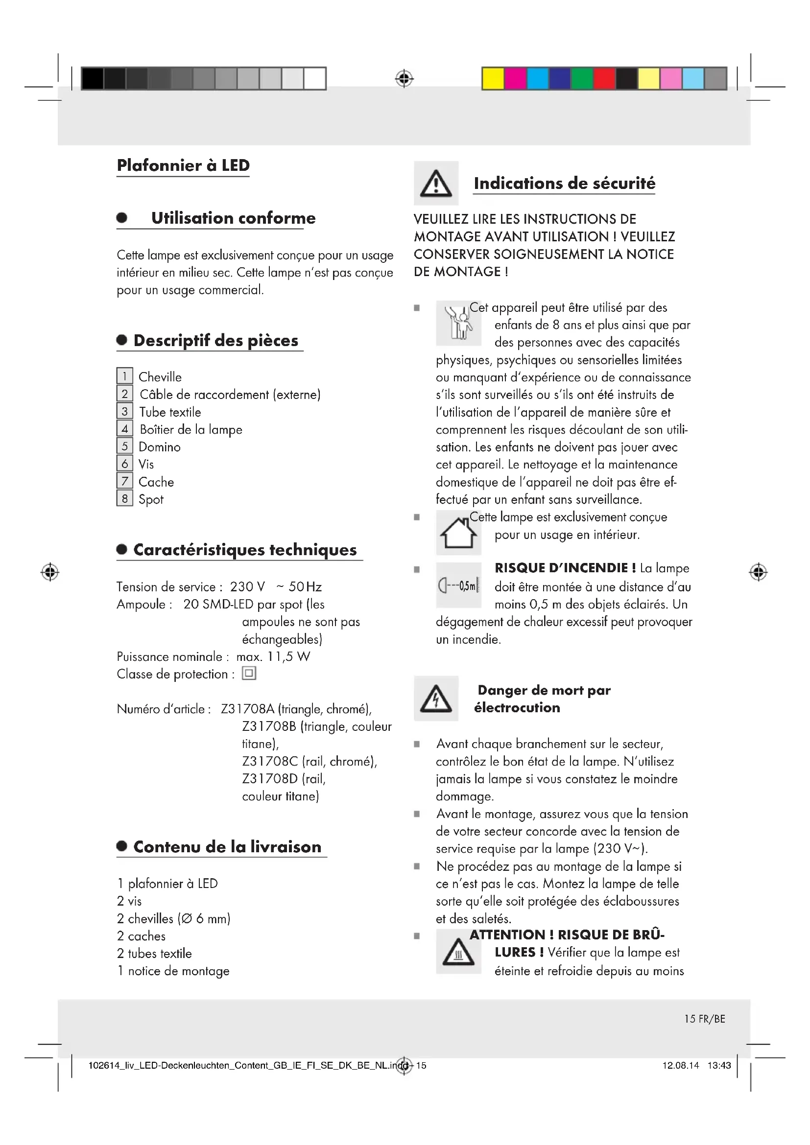 s‘orientent sur un angle d‘env. 90° verticalement et d‘env. 330° horizontalement, afin de projeter des accents lumineux précis (cf. fig. E). ATTENTION : les spots deviennent très chauds lors du fonctionnement. Eteignez la et laissez-la refroidir pendant 5 minutes avant d‘y toucher. Nettoyage et entretien Avant de procéder au nettoyage et à l‘entretien de votre lampe, coupez l‘alimentation électrique du secteur (ôtez le fusible ou bien coupez le disjoncteur dans le boîtier à fusibles - position 0), puis laissez refroidir la lampe au moins pendant 5 minutes ! Pour des raisons de sécurité électrique, il est interdit de nettoyer la lampe à l‘eau ou avec d‘autres li- quides ou encore de la plonger dans de l‘eau. N’utilisez aucun solvant, essence ou produit simi- laire. La lampe pourrait en être endommagée. Utilisez uniquement un chiffon sec non pelu- cheux pour le nettoyage. Mise au rebut L‘emballage se compose exclusivement de matières recyclables, qui peuvent être mises au rebut dans les déchetteries lo- cales. 102614_liv_LED-Deckenleuchten_Content_GB_IE_FI_SE_DK_BE_NL.indd 16 12.08.14 13:4317 FR/BE Renseignez-vous auprès de votre mairie ou de votre municipalité concernant les possibilités de mise au rebut des produits usagés. Ne jetez en aucun cas l‘appareil / l‘article à la poubelle normale. Éliminez l’appareil / l’article par l’inter- médiaire d’une entreprise d’élimination des ordures agréée, ou par le service de recyclage de votre commune. Respectez les prescriptions en vigueur. En cas de doutes, prenez contact avec l‘institution respon- sable de l‘élimination des ordures. Garantie Indépendamment de la garantie commerciale sous- crite, le vendeur reste tenu des défauts de conformité du bien et des vices rédhibitoires dans les conditions prévues aux articles L211-4 et suivants du Code de la consommation et aux articles 1641 et suivants du Code Civil. L’appareil a été fabriqué selon des critères de qua- lité stricts et contrôlé consciencieusement avant sa livraison. En cas de défaillance, vous êtes en droit de retourner ce produit au vendeur. La présente ga- rantie ne constitue pas une restriction de vos droits légaux. Cet appareil bénéficie d‘une garantie de 3ans à compter de sa date d’achat. La durée de garantie débute à la date d’achat. Veuillez conserver le ticket de caisse original. Il fera office de preuve d’achat. Si un problème matériel ou de fabrication devait survenir dans 3 ans suivant la date d‘achat de ce produit, nous assurons à notre discrétion la répara- tion ou le remplacement de l‘appareil sans frais supplémentaires. La garantie prend fin si le produit est endommagé suite à une utilisation inappropriée ou à un entretien défaillant. La garantie couvre les vices matériels et de fabricati on. Cette garantie ne s’étend pas aux pièces du produit soumises à une usure normale (p. ex. des batteries) et qui, par conséquent, peuvent être considérées comme des pièces d’usure, ni aux dommages sur des composants fragiles, comme des interrupteurs, des batteries et des éléments fabriqués en verre. 102614_liv_LED-Deckenleuchten_Content_GB_IE_FI_SE_DK_BE_NL.indd 17 12.08.14 13:4318 NL/BE LED-plafondlamp Correct gebruik Deze lamp is uitsluitend bedoeld voor het gebruik in droge ruimtes binnenshuis. De lamp is niet bestemd voor commercieel gebruik. Beschrijving van de onderdelen