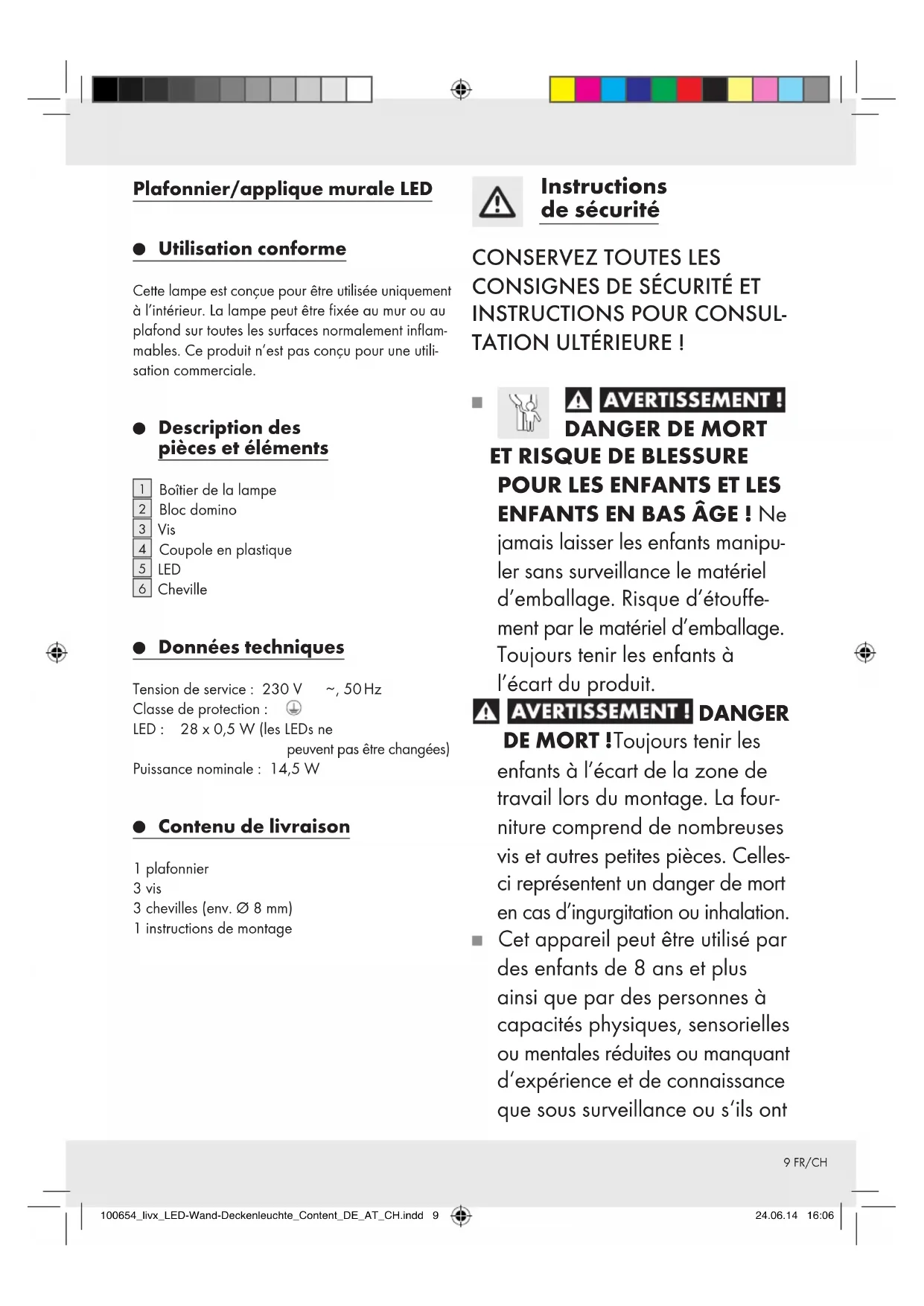 ENFANTS EN BAS ÂGE ! Ne jamais laisser les enfants manipu- ler sans surveillance le matériel d’emballage. Risque d’étouffe- ment par le matériel d’emballage. Toujours tenir les enfants à l’écart du produit. DANGER DE MORT ! Toujours tenir les enfants à l’écart de la zone de travail lors du montage. La four- niture comprend de nombreuses vis et autres petites pièces. Celles- ci représentent un danger de mort en cas d’ingurgitation ou inhalation. Cet appareil peut être utilisé par des enfants de 8 ans et plus ainsi que par des personnes à capacités physiques, sensorielles ou mentales réduites ou manquant d‘expérience et de connaissance que sous surveillance ou s‘ils ont 100654_livx_LED-Wand-Deckenleuchte_Content_DE_AT_CH.indd 9 24.06.14 16:0610 FR/CH été instruits de l‘utilisation sûre de cet appareil et des risques en découlant. Les enfants ne doivent pas jouer avec cet appareil. Le nettoyage et la maintenance domestique de l‘appareil ne doit pas être effectué par un enfant sans surveillance.
