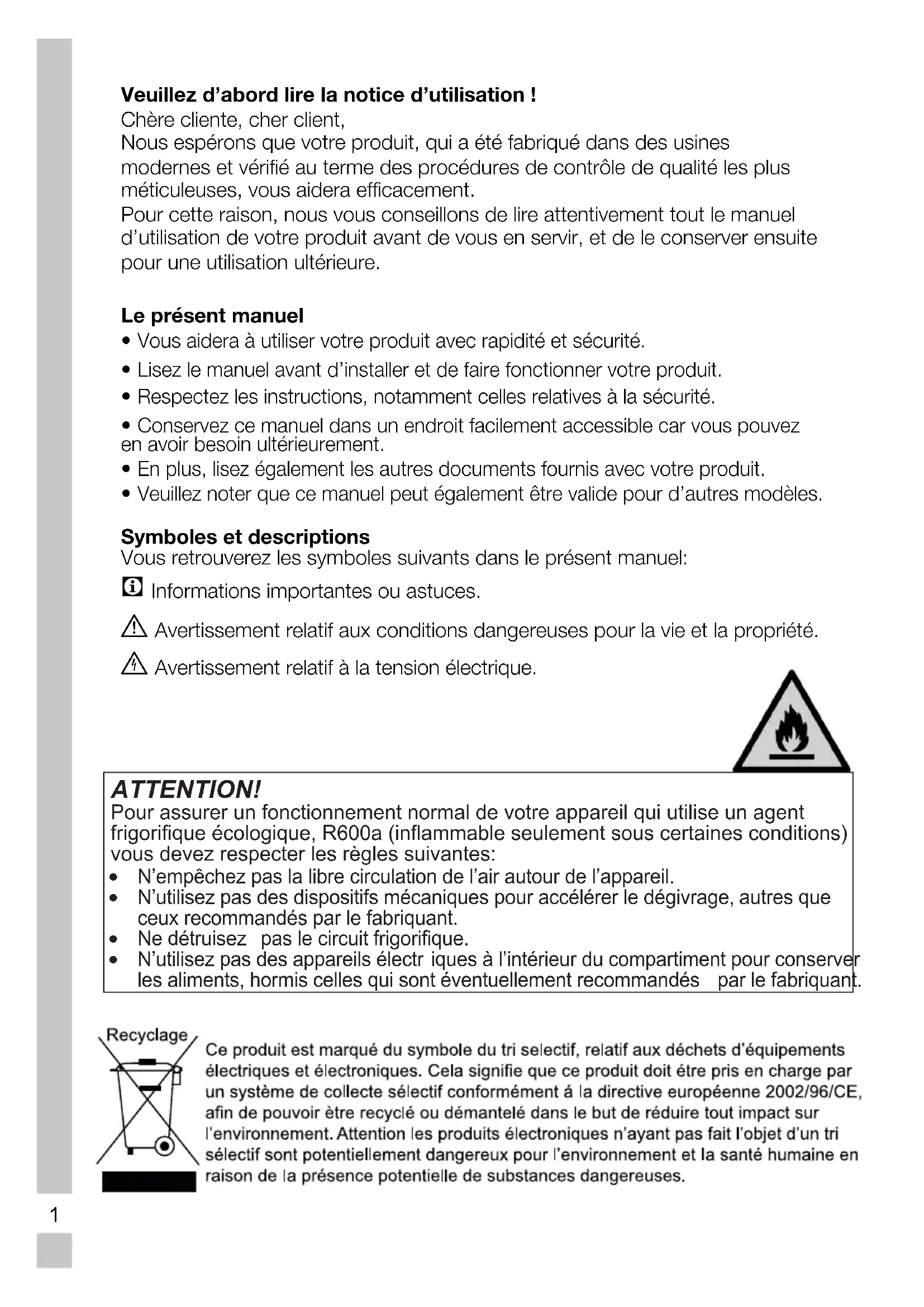 Veuillez noter que ce manuel peut également être valide pour d’autres modèles. Symboles et descriptions Vous retrouverez les symboles suivants dans le présent manuel: C Informations importantes ou astuces. A Avertissement relatif aux conditions dangereuses pour la vie et la propriété. B Avertissement relatif à la tension électrique. ATTENTION! Pour assurer un fonctionnement normal de votre appareil qui utilise un agent frigorifique écologique, R600a (inflammable seulement sous certaines conditions) vous devez respecter les règles suivantes:
