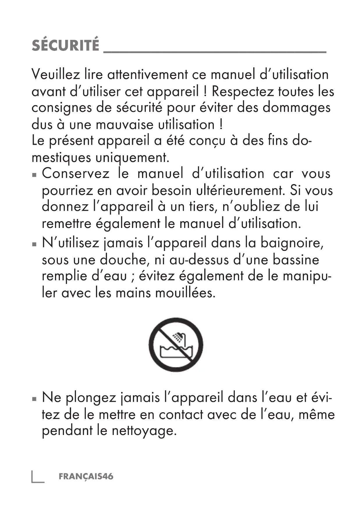N’utilisez jamais l’appareil dans la baignoire, sous une douche, ni au-dessus d’une bassine remplie d’eau ; évitez également de le manipu- ler avec les mains mouillées.