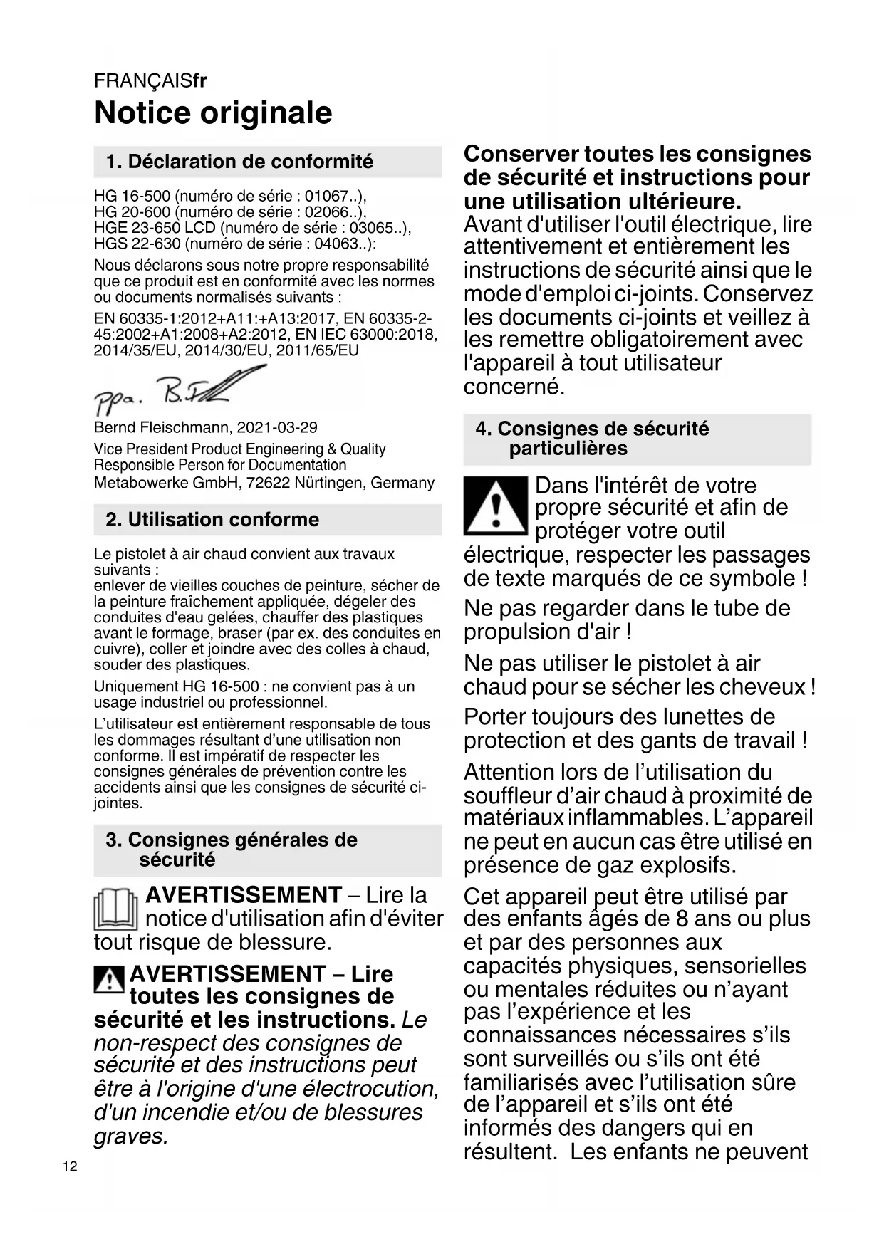 Notice originale HG 16-500 (numéro de série : 01067..), HG 20-600 (numéro de série : 02066..), HGE 23-650 LCD (numéro de série : 03065..), HGS 22-630 (numéro de série : 04063..): Nous déclarons sous notre propre responsabilité que ce produit est en conformité avec les normes ou documents normalisés suivants : EN 60335-1:2012+A11:+A13:2017, EN 60335-2- 45:2002+A1:2008+A2:2012, EN IEC 63000:2018, 2014/35/EU, 2014/30/EU, 2011/65/EU Bernd Fleischmann, 2021-03-29 Vice President Product Engineering & Quality Responsible Person for Documentation Metabowerke GmbH, 72622 Nürtingen, Germany Le pistolet à air chaud convient aux travaux suivants : enlever de vieilles couches de peinture, sécher de la peinture fraîchement appliquée, dégeler des conduites d'eau gelées, chauffer des plastiques avant le formage, braser (par ex. des conduites en cuivre), coller et joindre avec des colles à chaud, souder des plastiques. Uniquement HG 16-500 : ne convient pas à un usage industriel ou professionnel. L’utilisateur est entièrement responsable de tous les dommages résultant d’une utilisation non conforme. Il est impératif de respecter les consignes générales de prévention contre les accidents ainsi que les consignes de sécurité ci- jointes. AVERTISSEMENT – Lire la notice d'utilisation afin d'éviter tout risque de blessure. AVERTISSEMENT – Lire toutes les consignes de sécurité et les instructions. Le non-respect des consignes de sécurité et des instructions peut être à l'origine d'une électrocution, d'un incendie et/ou de blessures graves. Conserver toutes les consignes de sécurité et instructions pour une utilisation ultérieure. Avant d'utiliser l'outil électrique, lire attentivement et entièrement les instructions de sécurité ainsi que le mode d'emploi ci-joints. Conservez les documents ci-joints et veillez à les remettre obligatoirement avec l'appareil à tout utilisateur concerné. Dans l'intérêt de votre propre sécurité et afin de protéger votre outil électrique, respecter les passages de texte marqués de ce symbole ! Ne pas regarder dans le tube de propulsion d'air ! Ne pas utiliser le pistolet à air chaud pour se sécher les cheveux ! Porter toujours des lunettes de protection et des gants de travail ! Attention lors de l’utilisation du souffleur d’air chaud à proximité de matériaux inflammables. L’appareil ne peut en aucun cas être utilisé en présence de gaz explosifs. Cet appareil peut être utilisé par des enfants âgés de 8 ans ou plus et par des personnes aux capacités physiques, sensorielles ou mentales réduites ou n’ayant pas l’expérience et les connaissances nécessaires s’ils sont surveillés ou s’ils ont été familiarisés avec l’utilisation sûre de l’appareil et s’ils ont été informés des dangers qui en résultent. Les enfants ne peuvent