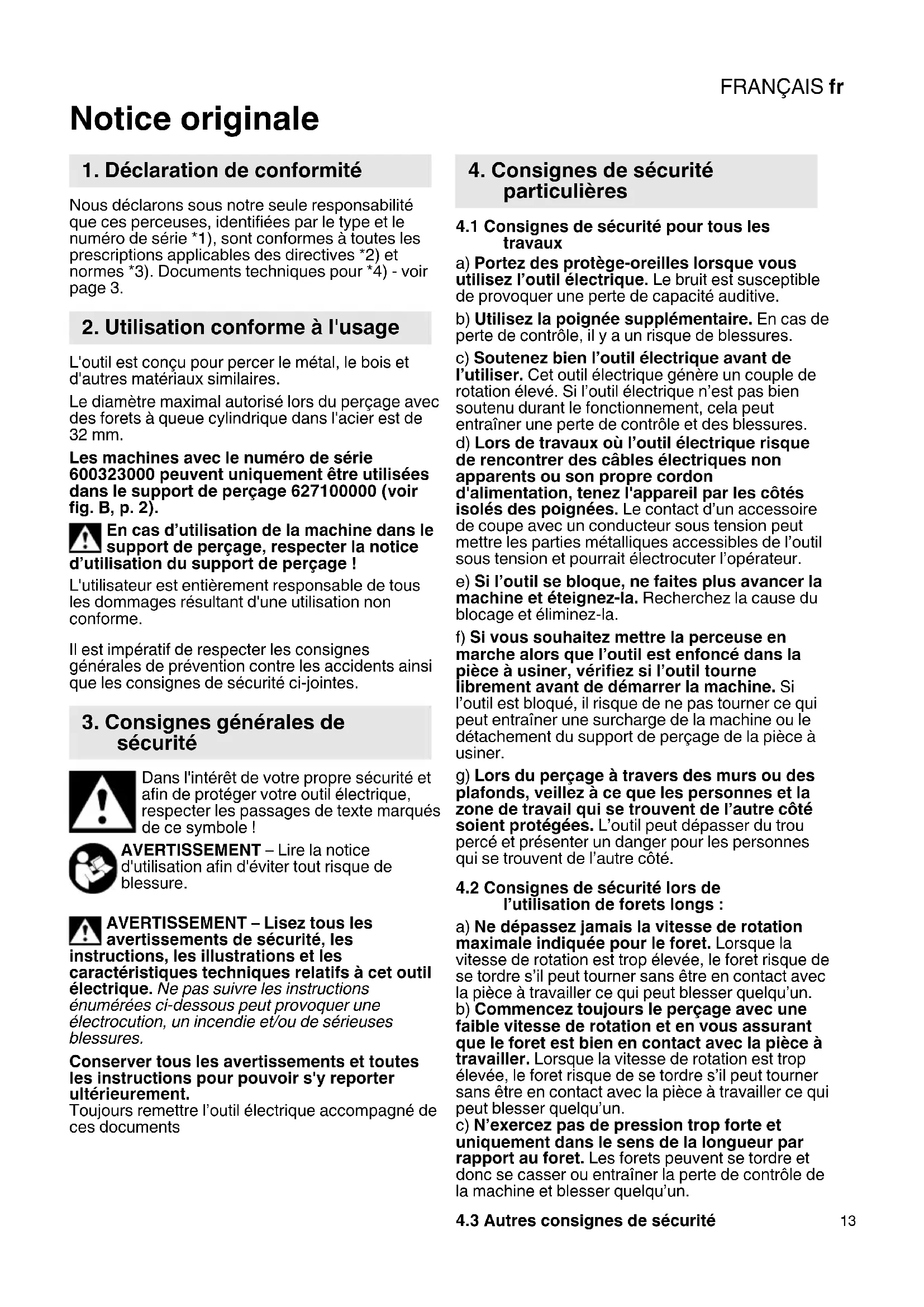 Notice originale Nous déclarons sous notre seule responsabilité que ces perceuses, identifiées par le type et le numéro de série *1), sont conformes à toutes les prescriptions applicables des directives *2) et normes *3). Documents techniques pour *4) - voir page 3. L'outil est conçu pour percer le métal, le bois et d'autres matériaux similaires. Le diamètre maximal autorisé lors du perçage avec des forets à queue cylindrique dans l'acier est de 32 mm. Les machines avec le numéro de série 600323000 peuvent uniquement être utilisées dans le support de perçage 627100000 (voir fig. B, p. 2). En cas d’utilisation de la machine dans le support de perçage, respecter la notice d’utilisation du support de perçage ! L'utilisateur est entièrement responsable de tous les dommages résultant d'une utilisation non conforme. Il est impératif de respecter les consignes générales de prévention contre les accidents ainsi que les consignes de sécurité ci-jointes. Dans l'intérêt de votre propre sécurité et afin de protéger votre outil électrique, respecter les passages de texte marqués de ce symbole ! AVERTISSEMENT – Lire la notice d'utilisation afin d'éviter tout risque de blessure. AVERTISSEMENT – Lisez tous les avertissements de sécurité, les instructions, les illustrations et les caractéristiques techniques relatifs à cet outil électrique. Ne pas suivre les instructions énumérées ci-dessous peut provoquer une électrocution, un incendie et/ou de sérieuses blessures. Conserver tous les avertissements et toutes les instructions pour pouvoir s'y reporter ultérieurement. Toujours remettre l’outil électrique accompagné de ces documents