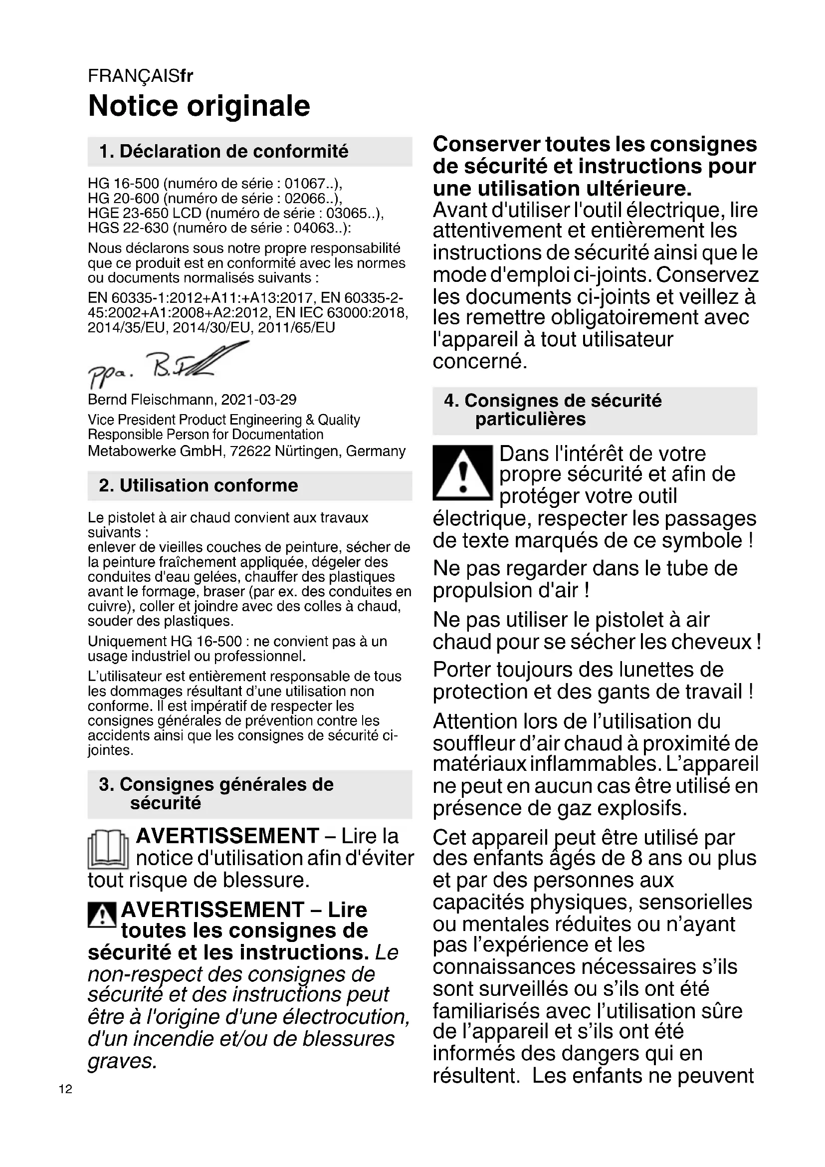 Notice originale HG 16-500 (numéro de série : 01067..), HG 20-600 (numéro de série : 02066..), HGE 23-650 LCD (numéro de série : 03065..), HGS 22-630 (numéro de série : 04063..): Nous déclarons sous notre propre responsabilité que ce produit est en conformité avec les normes ou documents normalisés suivants : EN 60335-1:2012+A11:+A13:2017, EN 60335-2- 45:2002+A1:2008+A2:2012, EN IEC 63000:2018, 2014/35/EU, 2014/30/EU, 2011/65/EU Bernd Fleischmann, 2021-03-29 Vice President Product Engineering & Quality Responsible Person for Documentation Metabowerke GmbH, 72622 Nürtingen, Germany Le pistolet à air chaud convient aux travaux suivants : enlever de vieilles couches de peinture, sécher de la peinture fraîchement appliquée, dégeler des conduites d'eau gelées, chauffer des plastiques avant le formage, braser (par ex. des conduites en cuivre), coller et joindre avec des colles à chaud, souder des plastiques. Uniquement HG 16-500 : ne convient pas à un usage industriel ou professionnel. L’utilisateur est entièrement responsable de tous les dommages résultant d’une utilisation non conforme. Il est impératif de respecter les consignes générales de prévention contre les accidents ainsi que les consignes de sécurité ci- jointes. AVERTISSEMENT – Lire la notice d'utilisation afin d'éviter tout risque de blessure. AVERTISSEMENT – Lire toutes les consignes de sécurité et les instructions. Le non-respect des consignes de sécurité et des instructions peut être à l'origine d'une électrocution, d'un incendie et/ou de blessures graves. Conserver toutes les consignes de sécurité et instructions pour une utilisation ultérieure. Avant d'utiliser l'outil électrique, lire attentivement et entièrement les instructions de sécurité ainsi que le mode d'emploi ci-joints. Conservez les documents ci-joints et veillez à les remettre obligatoirement avec l'appareil à tout utilisateur concerné. Dans l'intérêt de votre propre sécurité et afin de protéger votre outil électrique, respecter les passages de texte marqués de ce symbole ! Ne pas regarder dans le tube de propulsion d'air ! Ne pas utiliser le pistolet à air chaud pour se sécher les cheveux ! Porter toujours des lunettes de protection et des gants de travail ! Attention lors de l’utilisation du souffleur d’air chaud à proximité de matériaux inflammables. L’appareil ne peut en aucun cas être utilisé en présence de gaz explosifs. Cet appareil peut être utilisé par des enfants âgés de 8 ans ou plus et par des personnes aux capacités physiques, sensorielles ou mentales réduites ou n’ayant pas l’expérience et les connaissances nécessaires s’ils sont surveillés ou s’ils ont été familiarisés avec l’utilisation sûre de l’appareil et s’ils ont été informés des dangers qui en résultent. Les enfants ne peuvent