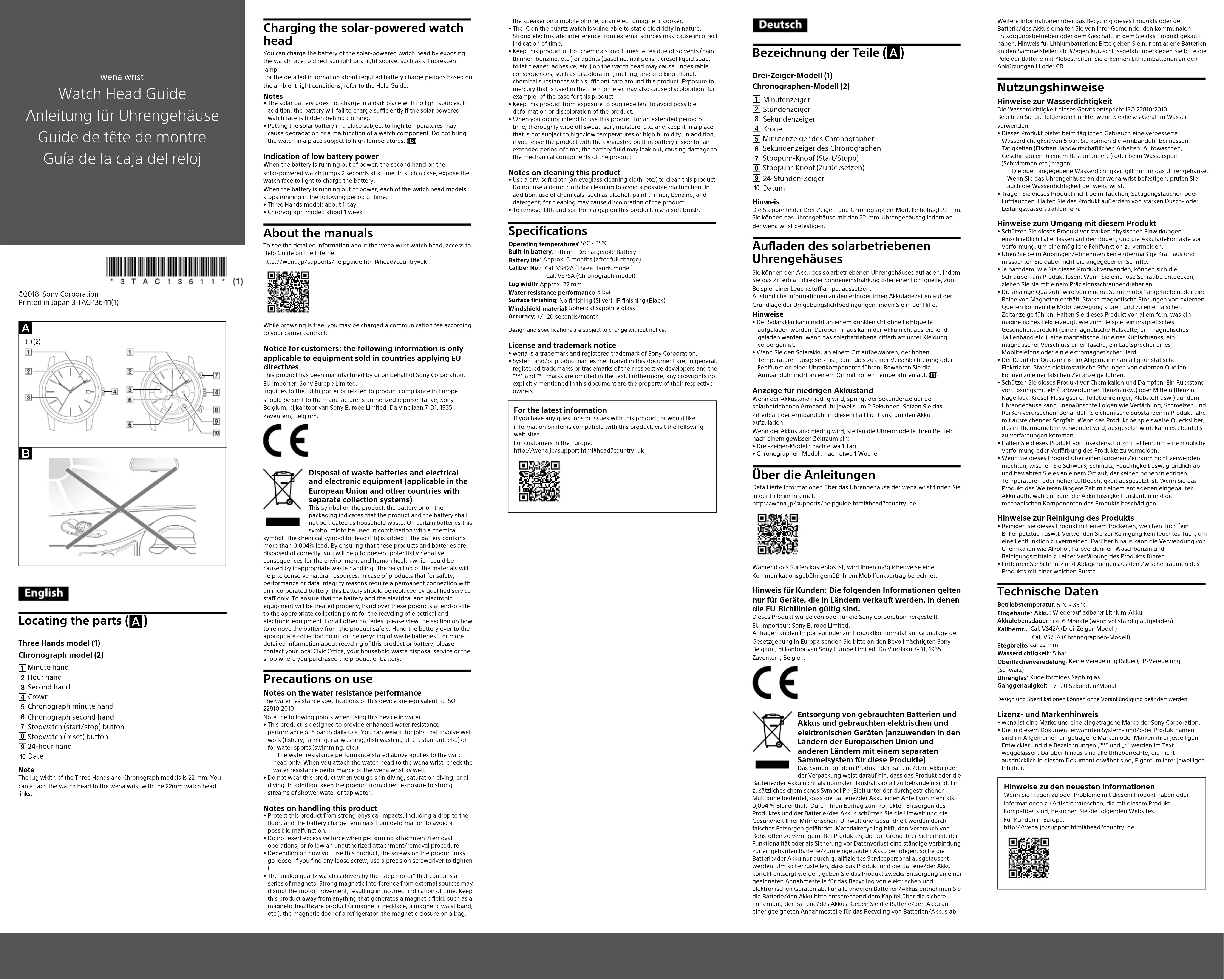 Date Note The lug width of the Three Hands and Chronograph models is 22mm. You can attach the watch head to the wena wrist with the 22mm watch head links.Elimination des piles et accumulateurs et des équipements électriques et électroniques usagés (applicable dans les pays de l'Union Européenne et dans les autres pays disposant de systèmes de collecte sélective) Ce symbole apposé sur le produit, la pile ou l’accumulateur, ou sur l’emballage, indique que le produit et les piles et accumulateurs fournis avec ce produit ne doivent pas être traités comme de simples déchets ménagers. Sur certains types de piles, ce symbole apparaît parfois combiné avec un symbole chimique. Le symbole pour le plomb (Pb) est rajouté lorsque ces piles contiennent plus de 0,004 % de plomb. En vous assurant que les produits, piles et accumulateurs sont mis au rebut de façon appropriée, vous participez activement à la prévention des conséquences négatives que leur mauvais traitement pourrait provoquer sur l’environnement et sur la santé humaine. Le recyclage des matériaux contribue par ailleurs à la préservation des ressources naturelles. Pour les produits qui, pour des raisons de sécurité, de performance ou d’intégrité des données, nécessitent une connexion permanente à une pile ou à un accumulateur intégré(e), il conviendra de vous rapprocher d’un Service Technique qualifié pour effectuer son remplacement. En rapportant votre appareil électrique, les piles et accumulateurs en fin de vie à un point de collecte approprié vous vous assurez que le produit, la pile ou l'accumulateur intégré sera traité correctement. Pour tous les autres cas de figure et afin d’enlever les piles ou accumulateurs en toute sécurité de votre appareil, reportez-vous au manuel d’utilisation. Rapportez les piles et accumulateurs, et les équipements électriques et électroniques usagés au point de collecte approprié pour le recyclage. Pour toute information complémentaire au sujet du recyclage de ce produit ou des piles et accumulateurs, vous pouvez contacter votre municipalité, votre déchetterie locale ou le point de vente où vous avez acheté ce produit. Précautions relatives à l’utilisation Remarques relatives à l’imperméabilité Les spécifications de l’imperméabilité de cet appareil sont équivalentes à ISO 22810:2010 Notez les points suivants lors de l’utilisation de l’appareil dans l’eau.