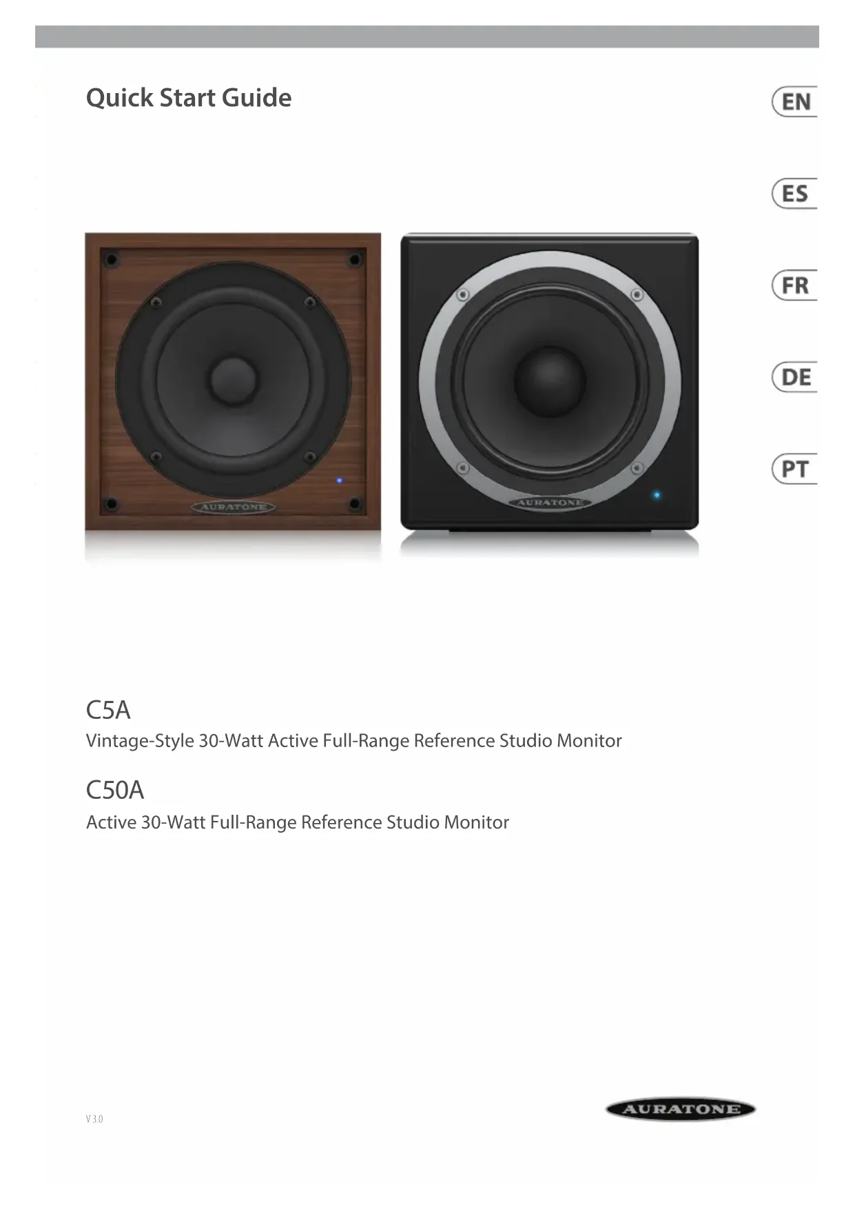 Avant de relier cet équipement au secteur, assurez-vous que la tension secteur de votre région soit compatible avec l’appareil. Veillez à remplacer les fusibles uniquement par des modèles exactement de même taille et de même valeur électrique — sans aucuneexception. Important information Aspectos importantes Informations importantes 17Quick Start Guide16 C5A/C50A Audio Inputs XLR connector Balanced input ¼" TRS Balanced input RCA Unbalanced input Input impedance 10 kΩ Input trim –6 dB to +6 dB Max. input level +20 dBu Transducer Full-range driver 5 ¼" speaker Amplier Output Power RMS @ 1 % THD (sine wave) 30 W @ 8 Ω Peak power 36 W @ 8 Ω System Specication Frequency range C50A 90 Hz to 17 kHz C5A 150 Hz to 15 kHz Power Supply Fuse