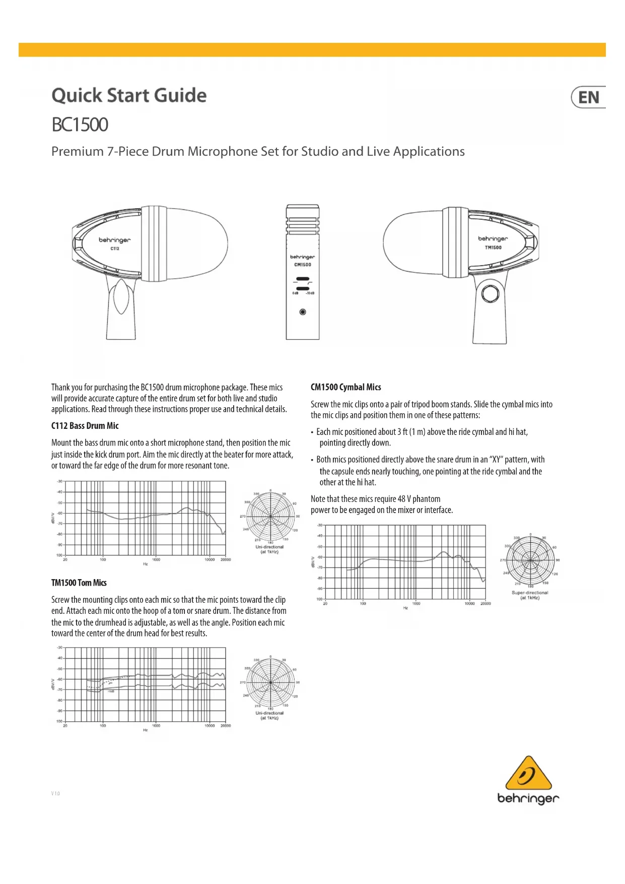 - Ambos micros colocados directamente encima de la caja en un patrón “XY”, con los extremos de sus cápsulas prácticamente tocándose, uno apuntando hacia el plato ride y el otro hacia el charles o hi hat. Tenga en cuenta que estos micros necesitan alimentación fantasma de 48 V para ser conectados a una mesa de mezclas o interface. Merci d’avoir acheté le kit de micro batterie BC1500. Ces micros vous permettent de capter avec précision le son de tous les éléments de votre batterie sur scène ou en studio. Ce mode d’emploi va vous fournir les instructions et détails techniques nécessaires pour une utilisation optimale. Micro grosse caisse C112 Placez le micro sur un pied court puis positionnez-le dans l’évent de la grosse caisse. Orientez le micro vers la batte pour plus d’attaque ou vers le bord de la grosse caisse pour capter plus de résonnance. Micros pour tom TM1500 Vissez les pinces de montage sur chaque micro. Accrochez les micros sur le cerclage des toms ou de la caisse claire. Vous pouvez essayer diérentes distances orientation du micro par rapport à la peau du fût, mais viser le centre de la peau permet généralement d’obtenir de très bons résultats. Micros pour cymbales CM1500 Vissez les pinces des micros sur deux trépieds pour micro. Placez les micros dans les pinces puis positionnez-les de l’une de ces deux manières :