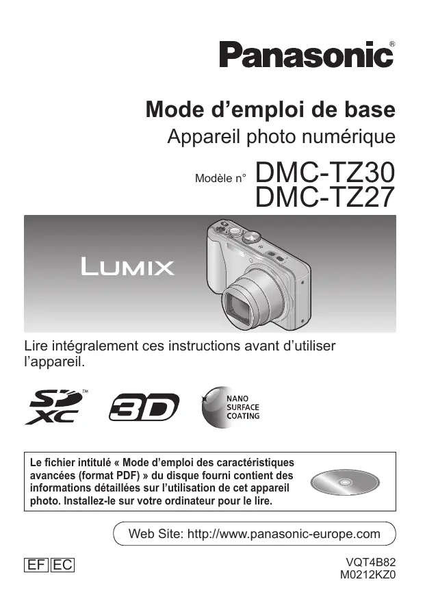 Mode d’emploi de base Appareil photo numérique Modèle n° DMC-TZ30 DMC-TZ27 Lire intégralement ces instructions avant d’utiliser l’appareil. Le fichier intitulé « Mode d’emploi des caractéristiques avancées (format PDF) » du disque fourni contient des informations détaillées sur l’utilisation de cet appareil photo. Installez-le sur votre ordinateur pour le lire. Web Site: http://www.panasonic-europe.com EF EC VQT4B82 M0212KZ0 À notre clientèle, Nous tenons à vous remercier d’avoir choisi cet appareil photo numérique Panasonic. Veuillez lire attentivement le présent manuel et le conserver pour référence ultérieure. Veuillez noter que les véritables commandes, composantes, options de menu, etc., de votre appareil photo numérique peuvent avoir une apparence différente de celle des illustrations du présent Mode d’emploi. Il importe de respecter les droits d’auteur.