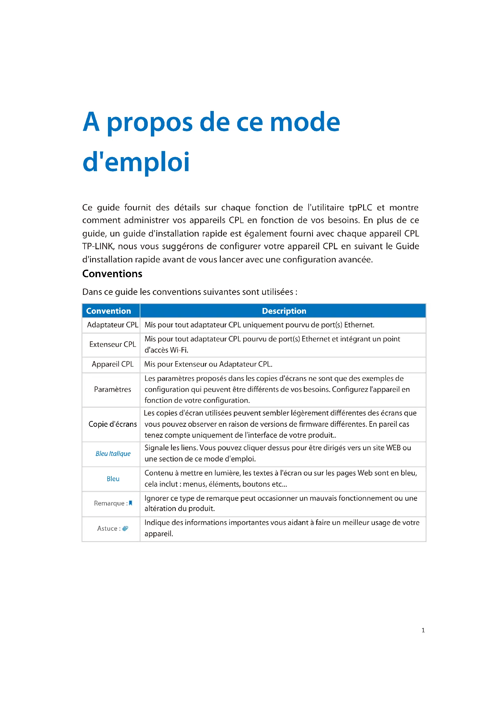 - 4.5. Astuces d'utilisation A propos de ce mode d'emploi Ce guide fournit des détails sur chaque fonction de l'utilitaire tpPLC et montre comment administrer vos appareils CPL en fonction de vos besoins. En plus de ce guide, un guide d'installation rapide est également fourni avec chaque appareil CPL TP-LINK, nous vous suggérons de configurer votre appareil CPL en suivant le Guide d'installation rapide avant de vous lancer avec une configuration avancée. Conventions Dans ce guide les conventions suivantes sont utilisées : Convention Description Adaptateur CPL p. 18