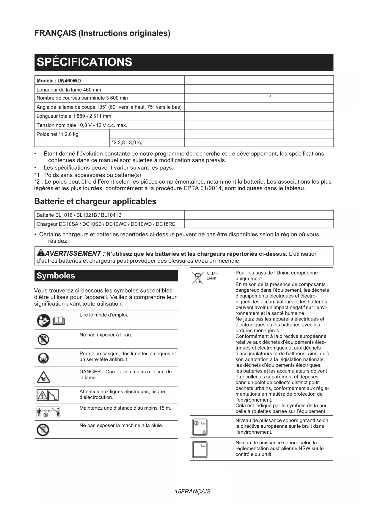 - Batterie et chargeur de marque Makita NOTE : Il se peut que certains éléments de la liste soient compris dans l’emballage de l’outil en tant qu’accessoiresstandard.Ilspeuventvarierd’unpays àl’autre.25 DEUTSCH DEUTSCH (Original-Anleitung) TECHNISCHE DATEN Modell: UN460WD Messerlänge 460 mm Hubzahl pro Minute 3.600 min