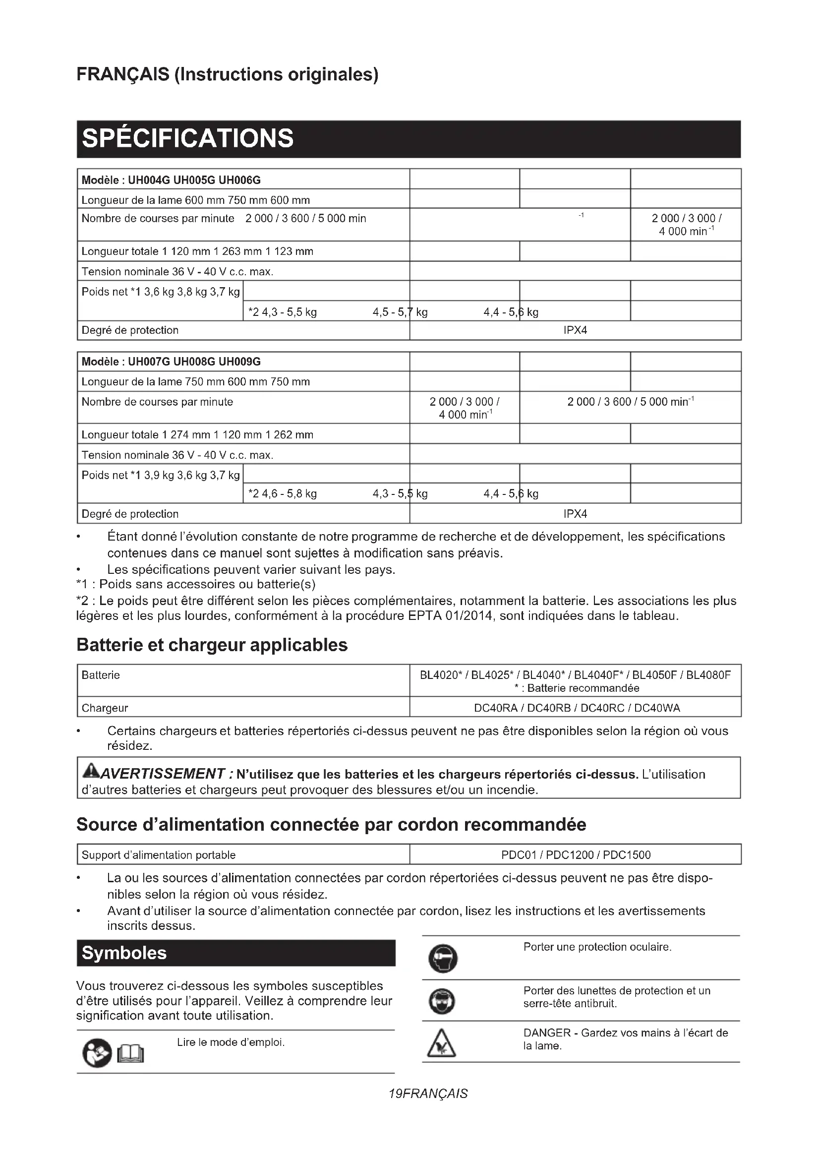 Longueur totale 1 120 mm 1 263 mm 1 123 mm Tension nominale 36 V - 40 V c.c. max. Poids net *1 3,6 kg 3,8 kg 3,7 kg *2 4,3 - 5,5 kg 4,5 - 5,7 kg 4,4 - 5,6 kg Degré de protection IPX4 Modèle : UH007G UH008G UH009G Longueur de la lame 750 mm 600 mm 750 mm Nombredecoursesparminute 2 000 / 3 000 / 4 000 min