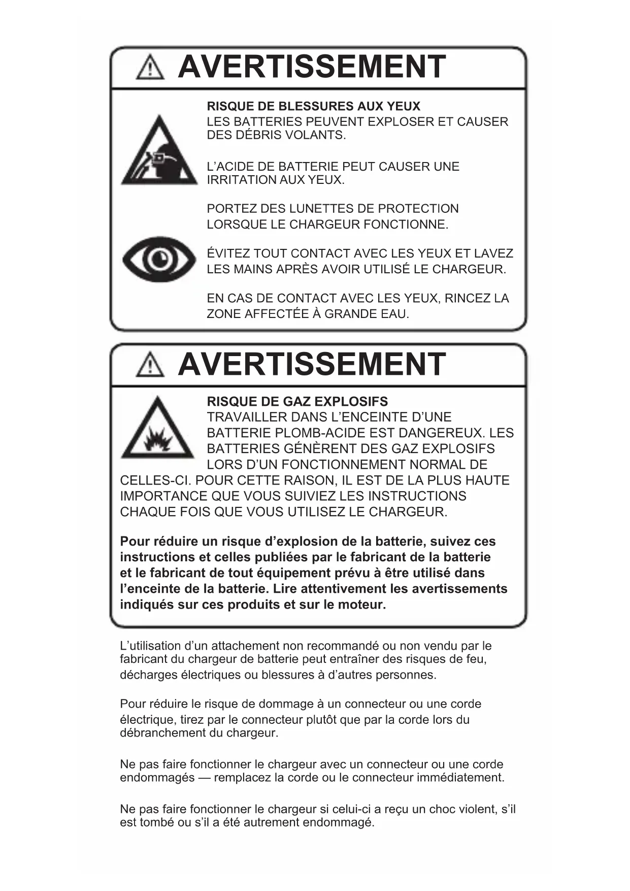 - Ce chargeur de batterie est pour charger les BATTERIES PLOMB-ACIDE SEULEMENT. N’UTILISEZ PAS LE CHARGEUR DE BATTERIE POUR DES BATTERIES À PILES SÈCHES COMMUNÉMENT UTILISÉES POUR LES APPAREILS ÉLECTROMÉNAGERS. CES TYPES DE BATTERIES PEUVENT ÉCLATER ET CAUSER DES DOMMAGES À LA PROPRIÉTÉ, DES BLESSURES PERSONNELLES OU LA MORT.
